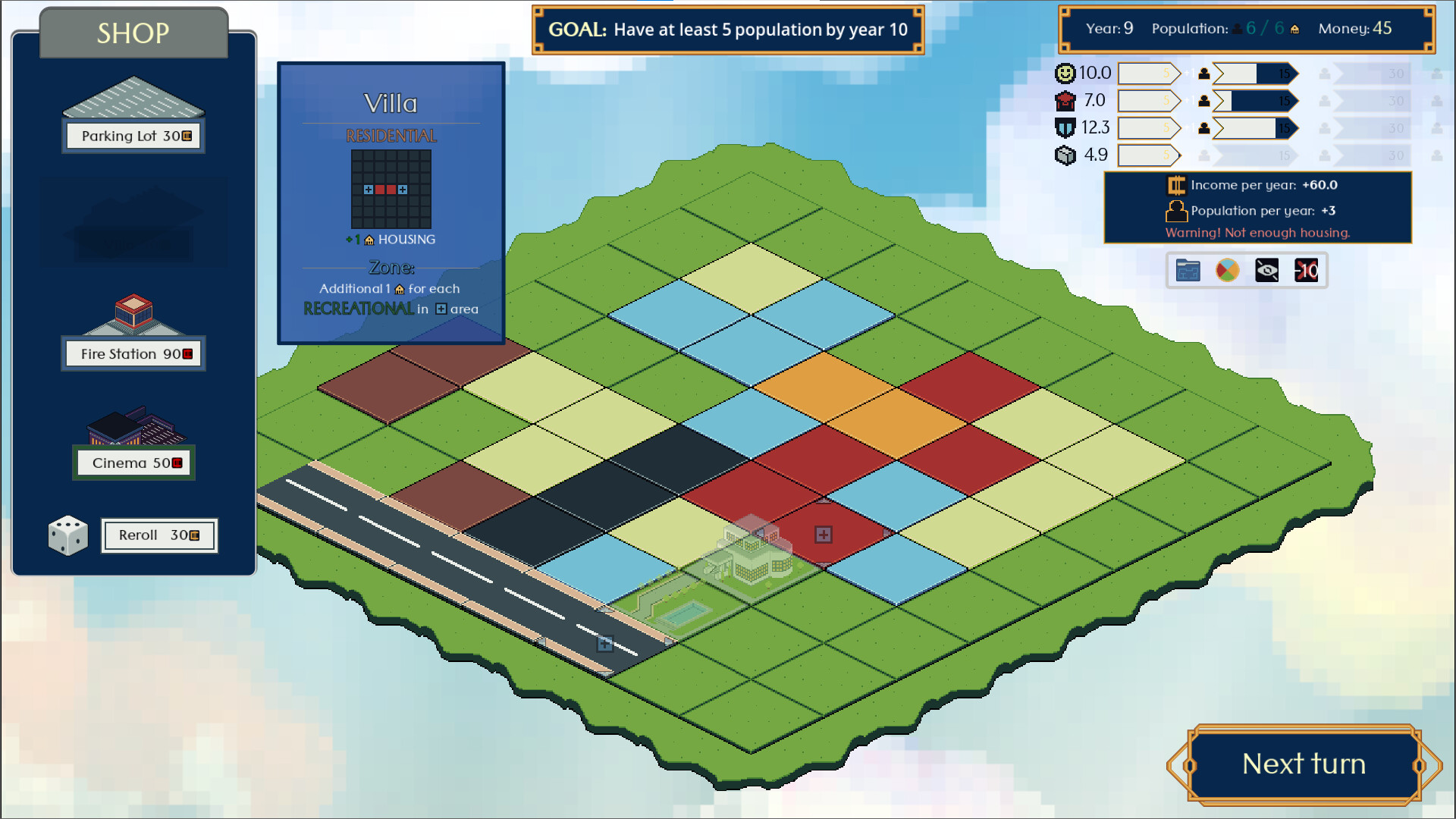 10 Year City is an isometric city-building puzzle game where placement is everything. Draft buildings from the shop, plan tile spaces carefully and chain adjacency bonuses. Grow your population and see if you can build a thriving city in just 10 years!