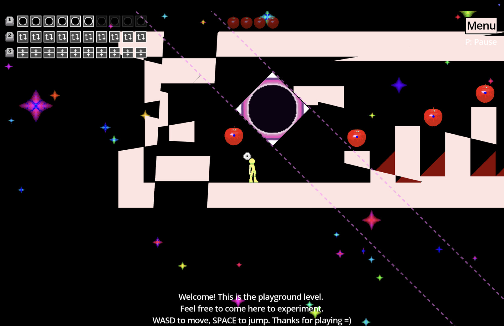 A puzzle platformer passion project where you manipulate the fabric of space to collect some apples. Tear holes, rotate chunks, and mirror entire columns of space across each other. Collect all the apples with a given set of abilities in each stage.