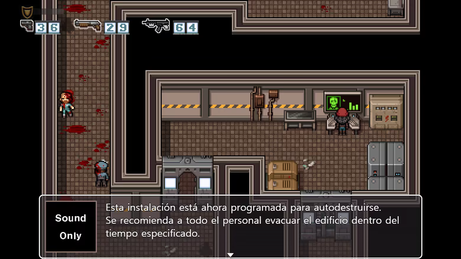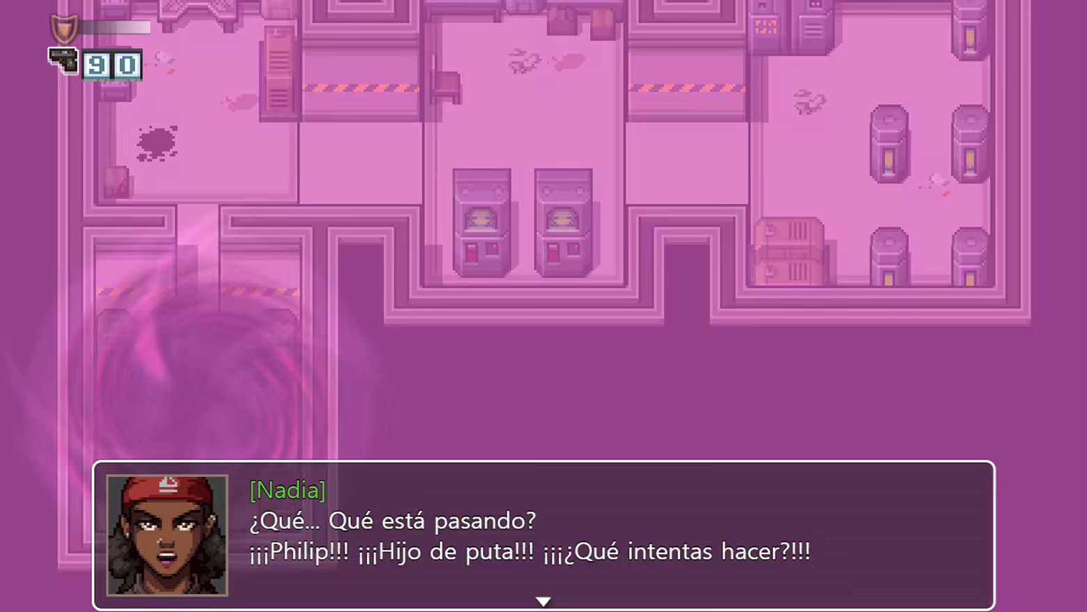 Nadia's Revenge is a top-down 2D pixel-based game where players fight enemies with firearms and solve puzzles to progress through the story, while making choices at branch points that lead to two different endings.