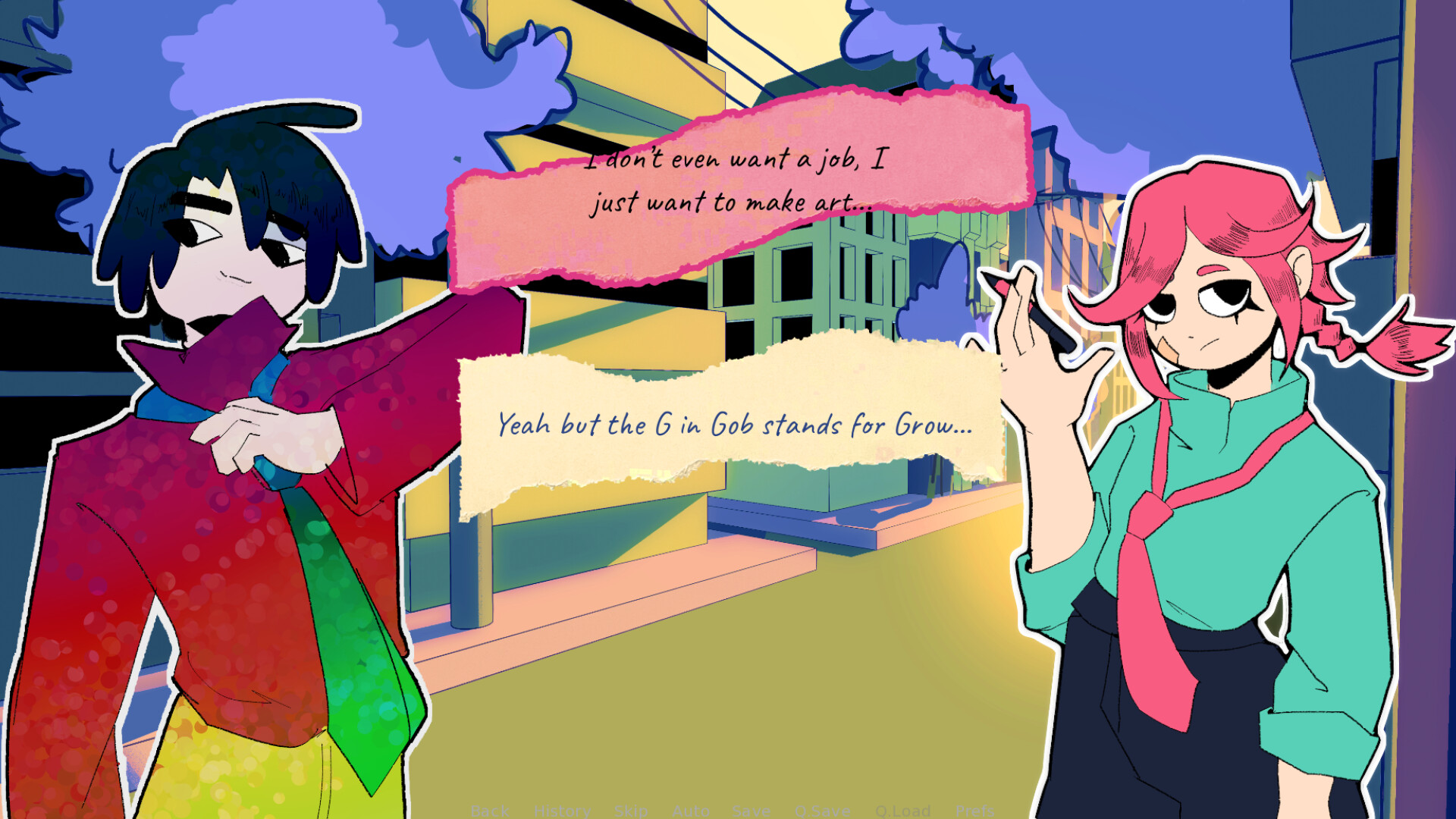 JAS: Job App Sux!  is a short visual novel from the perspective of an artist grappling with imposter syndrome and a competitive job market. Born from the experiences of JAS’s developers, this game invites the player to make choices for their future amidst a chaotic career landscape riddled with obstacles. What is the right path? How much are you willing to risk to make your dream come true? Or is it better to play it safe? Your life is on the line.