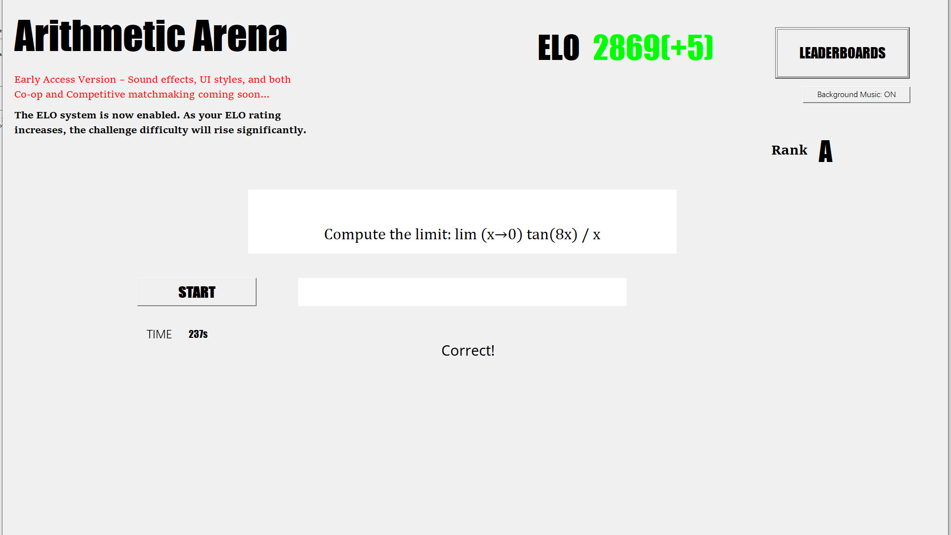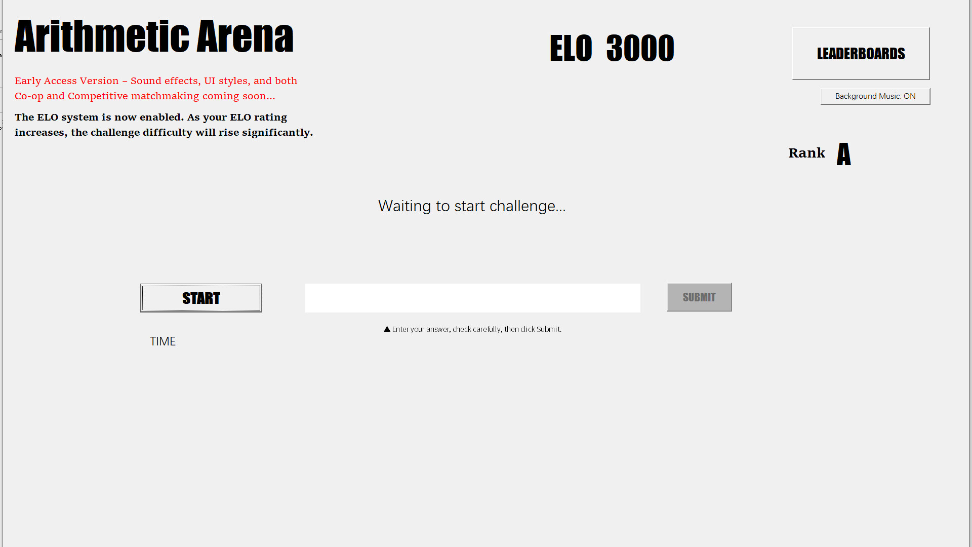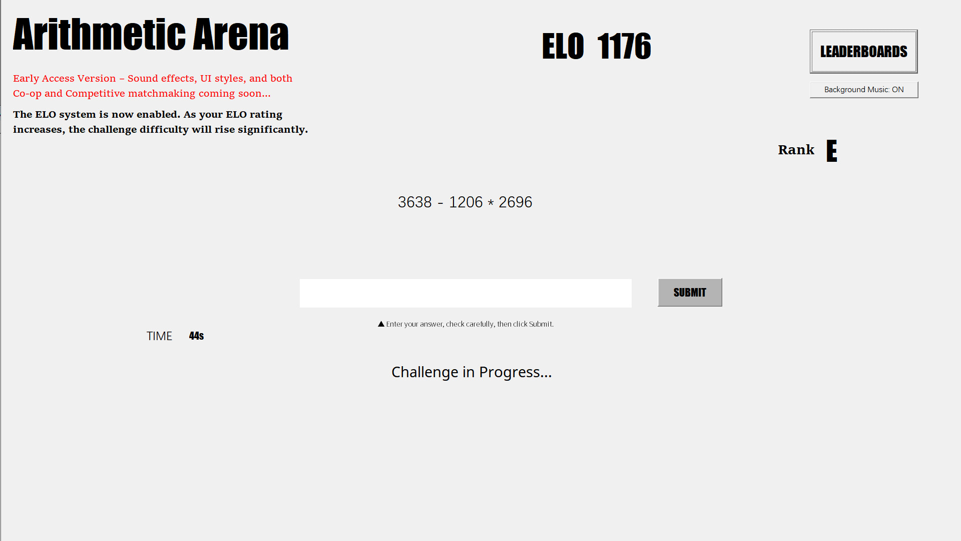 Arithmetic Arena is a competitive math-challenge game built on the ELO ranking system. Each challenge tests not only your speed and accuracy, but also your ability to stay calm and composed. Confidence and composure will let you truly enjoy the game and find fun in every challenge.