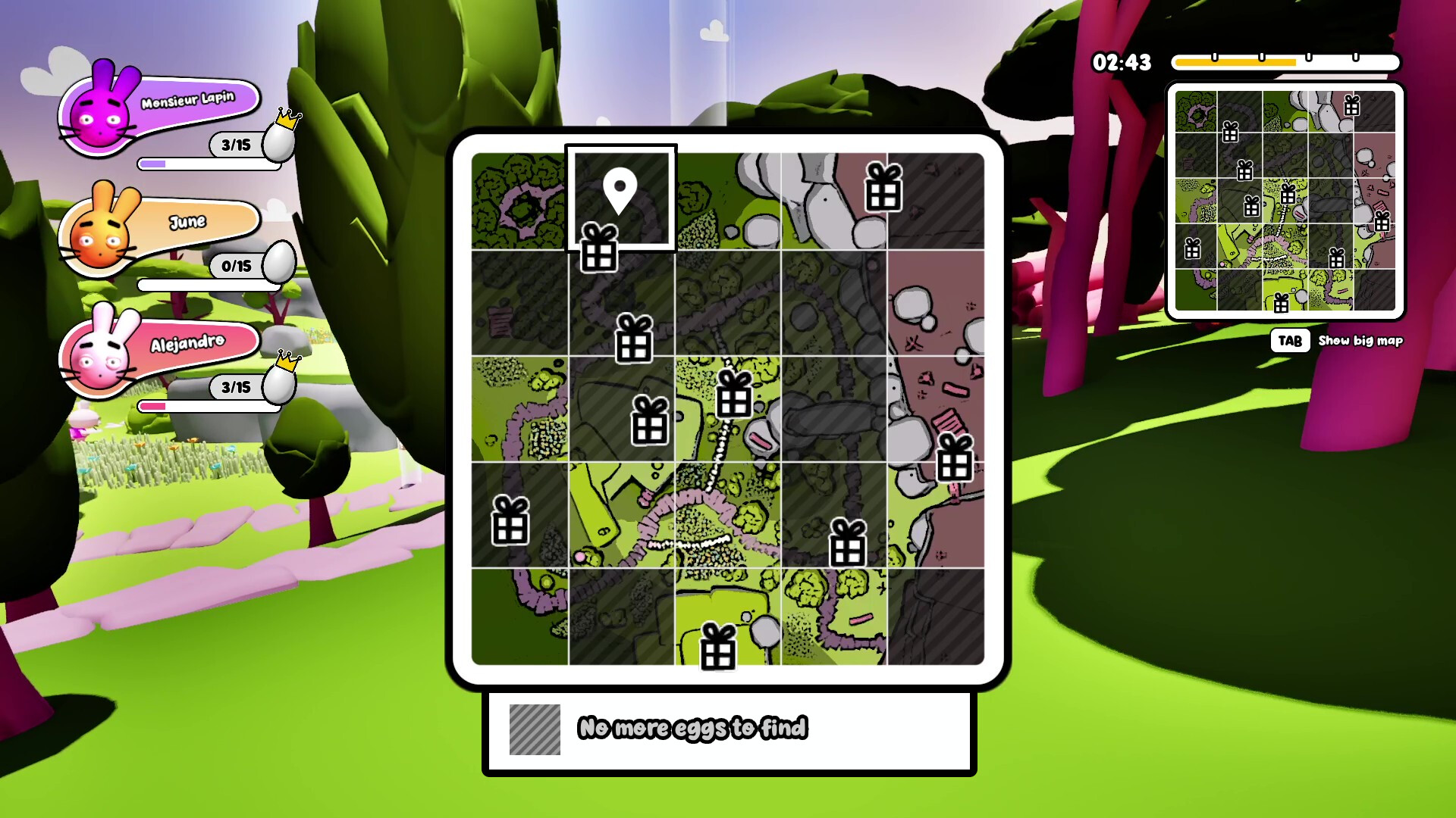 When the seeking phase begins, race to find as many eggs as possible. The minimap shows which areas still hide eggs. Be faster than your friends — or slow them down.