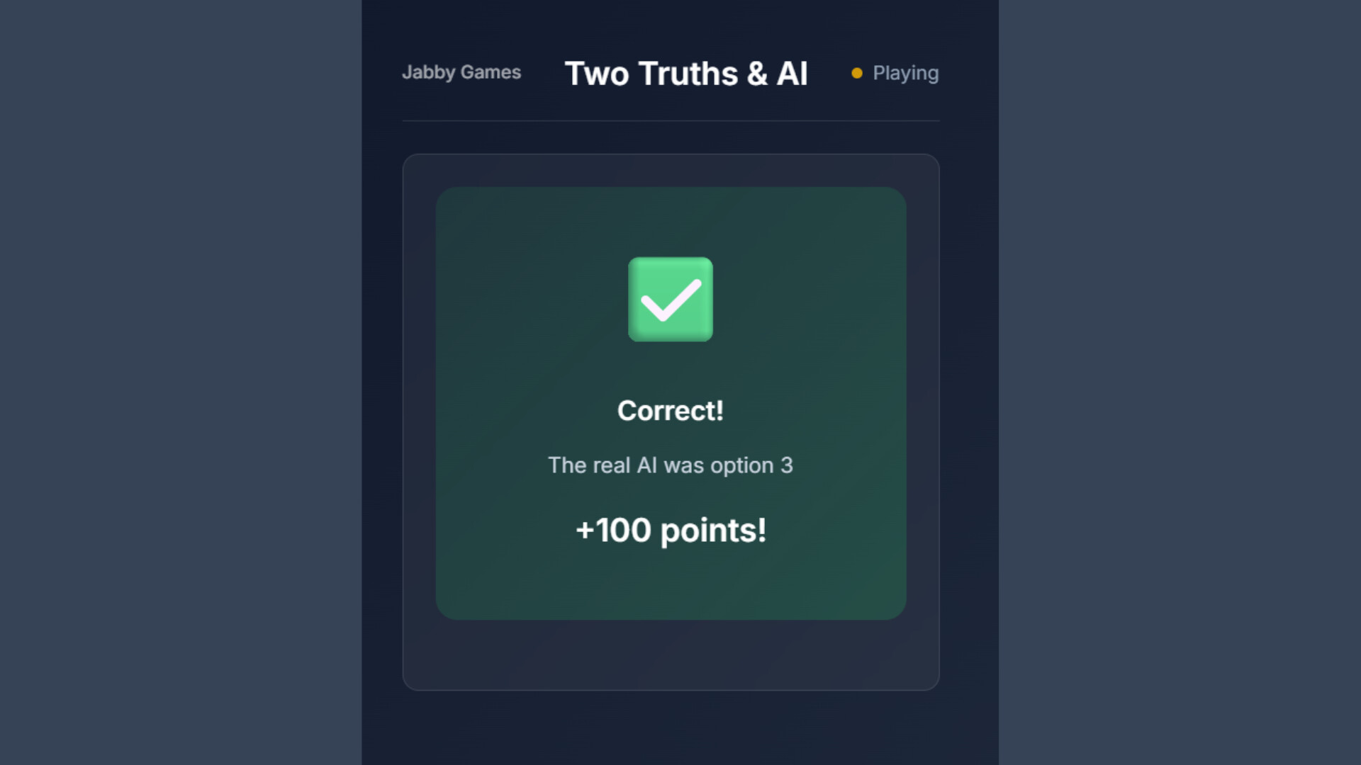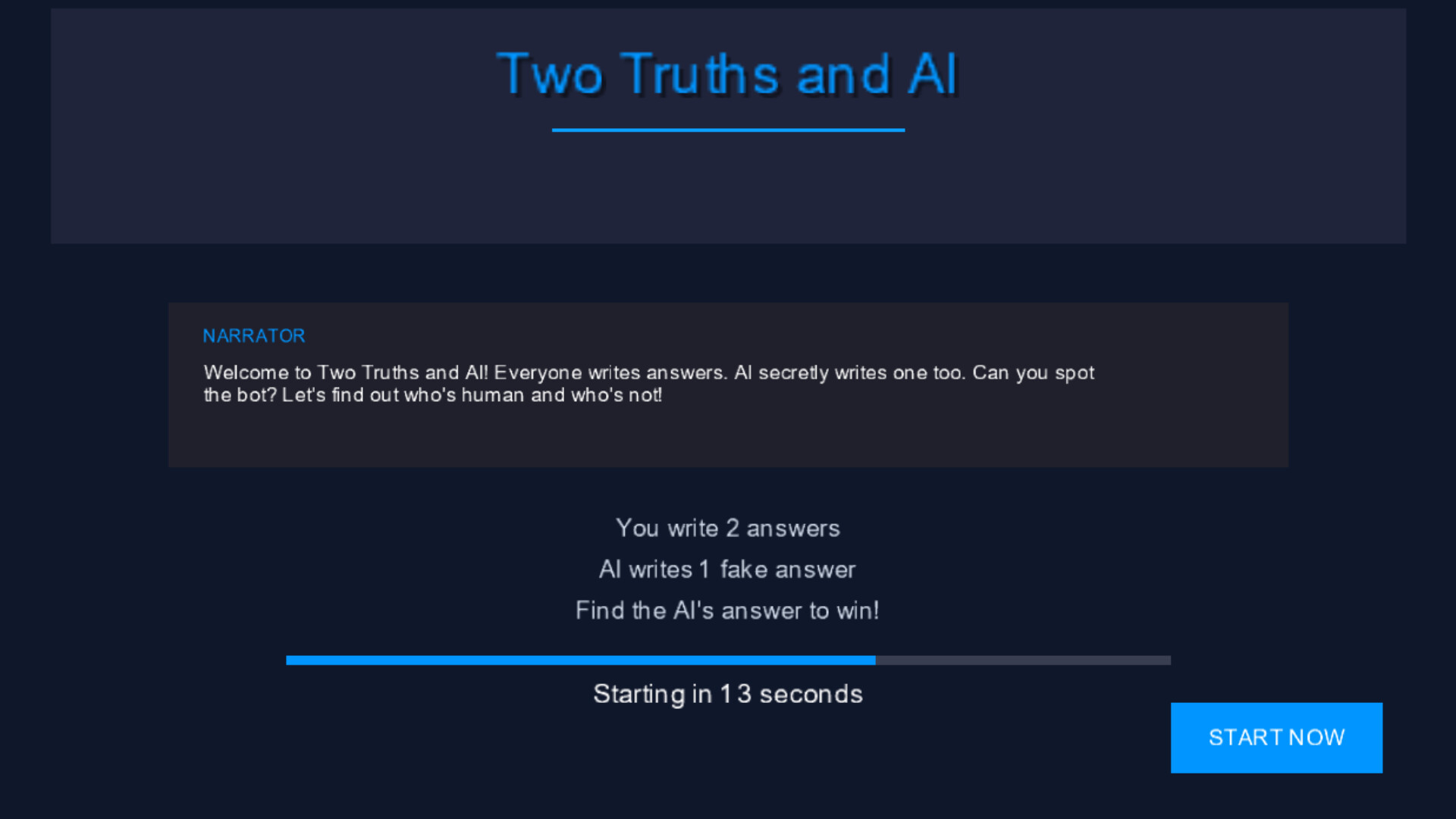 Each player answers two questions in their own style. The AI fakes a third response, trying to blend in. Everyone guesses which answer came from the bot. Spot the impostor, or trick your friends into thinking you were the AI.