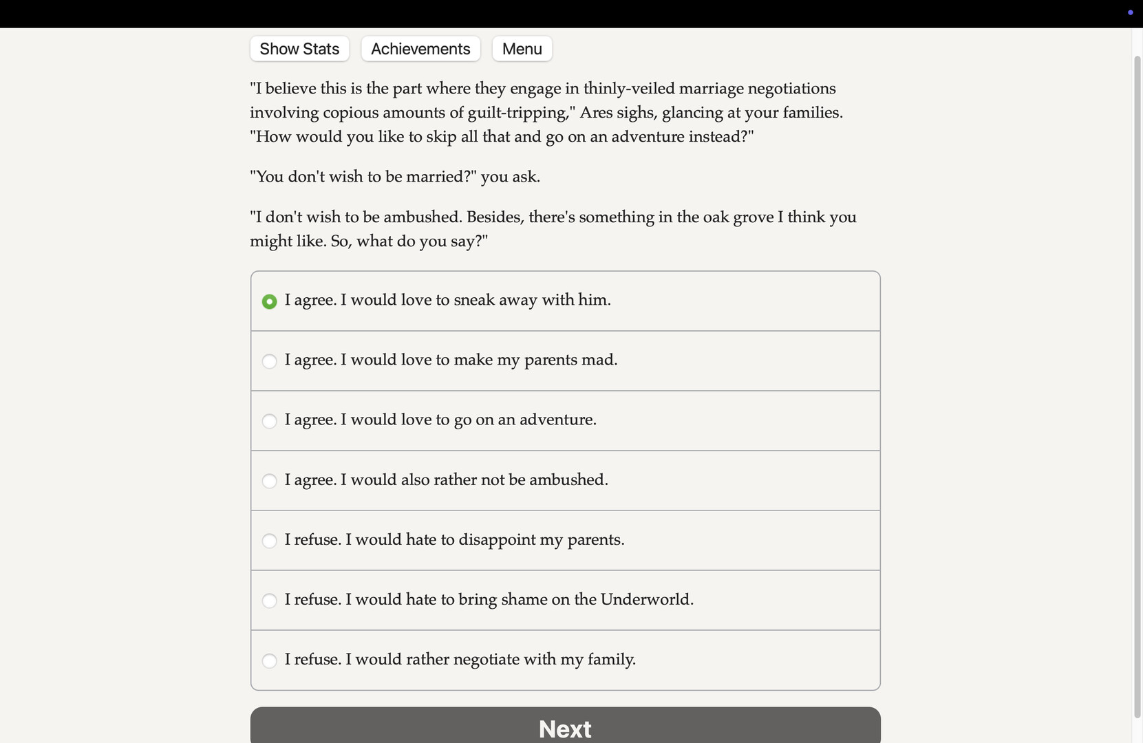 Your parents are keen to strengthen the alliance between the realms by marrying you to Ares, Olympian god of war. Such a unified show of power might stop the slaughter before it starts. But is that what you want? And is that truly what is best for the gods?