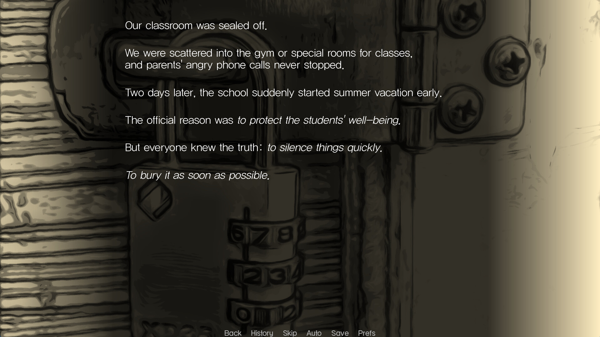A free, story-driven short visual novel with no choices. The narrative weaves between the present (202X) and the past (200X), depicting the suffocating chain of violence within a Korean school setting with stark realism.