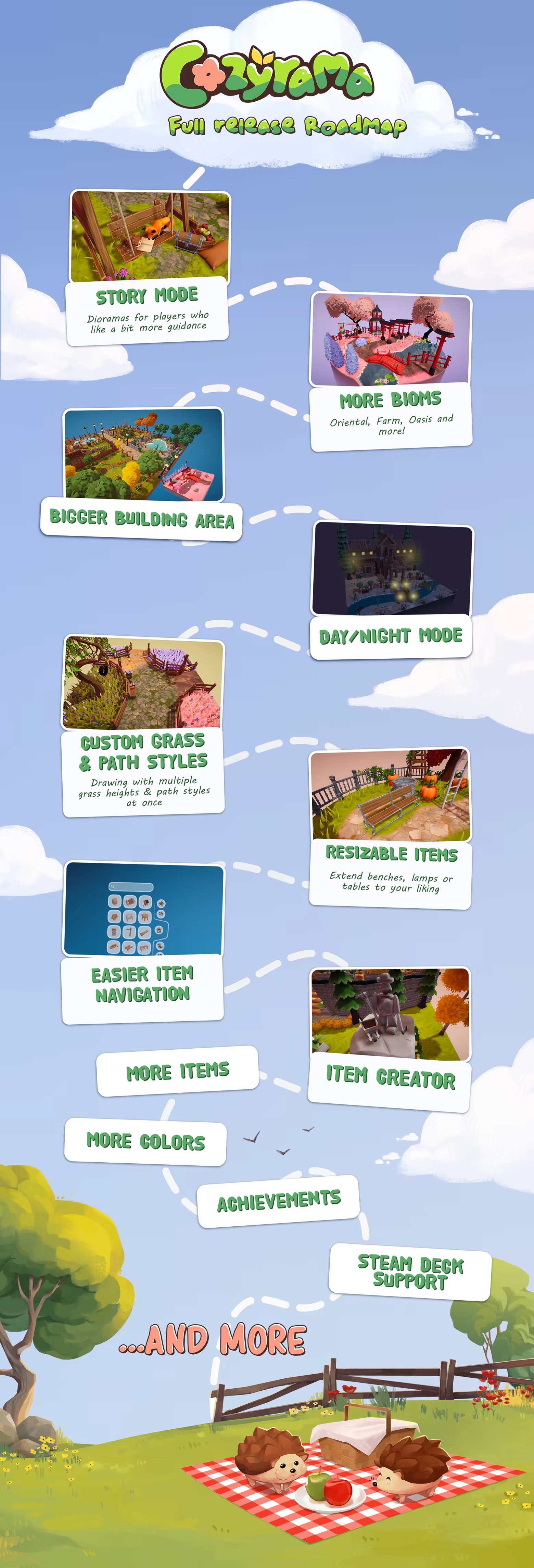 Cozyrama Demo features sandbox mode, giving you everything you need to create a beautiful diorama. It’s a perfect little taste of what’s to come while you wait for the full version!