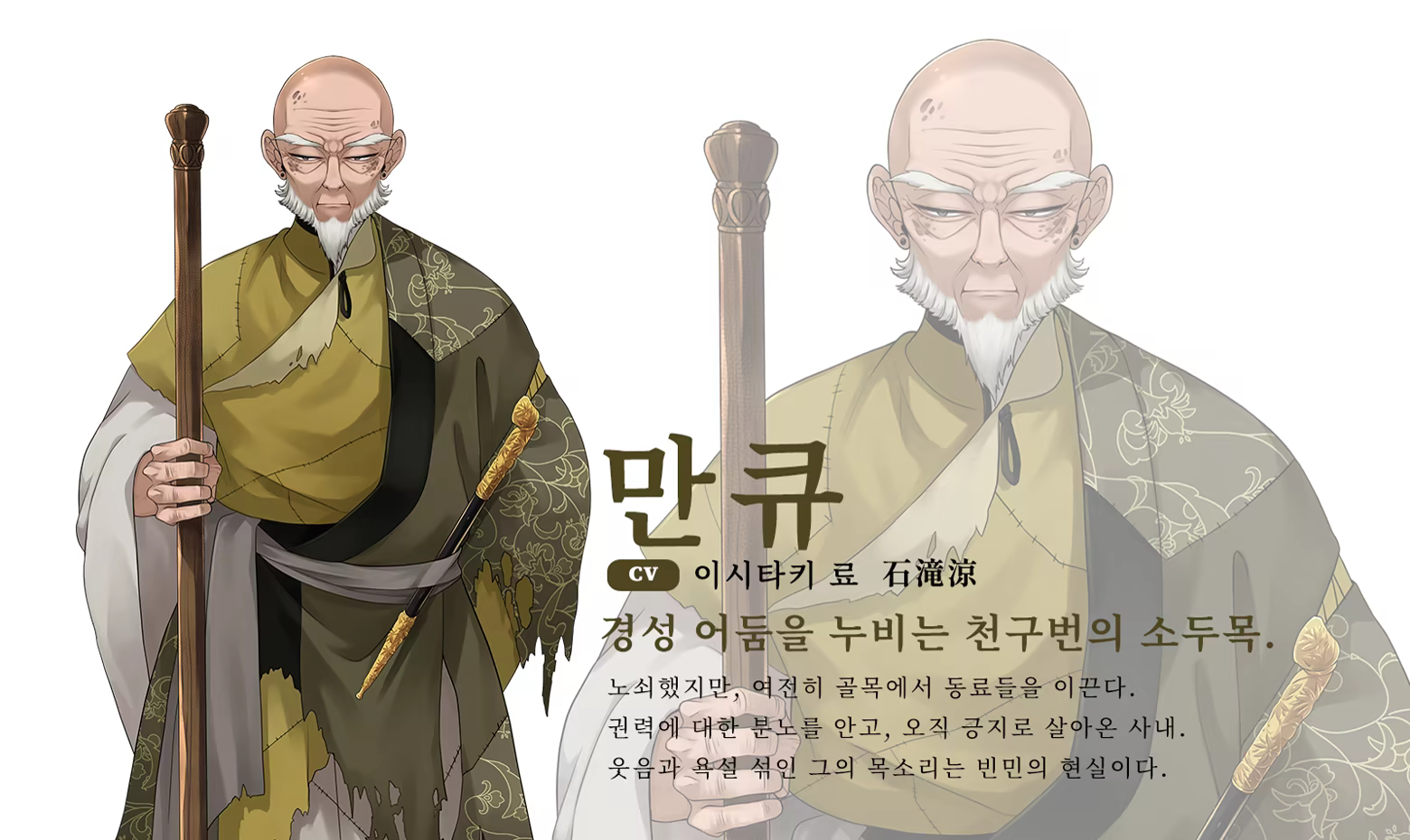 위엄 속에 계산된 언행이 깃든 인물. 기코쿠의 질서를 지키는 척하지만, 그가 지키려는 건 오직 ‘비성당’이다. 파군과 타케코센을 이끌며, 차세대 비성을 주시한다.