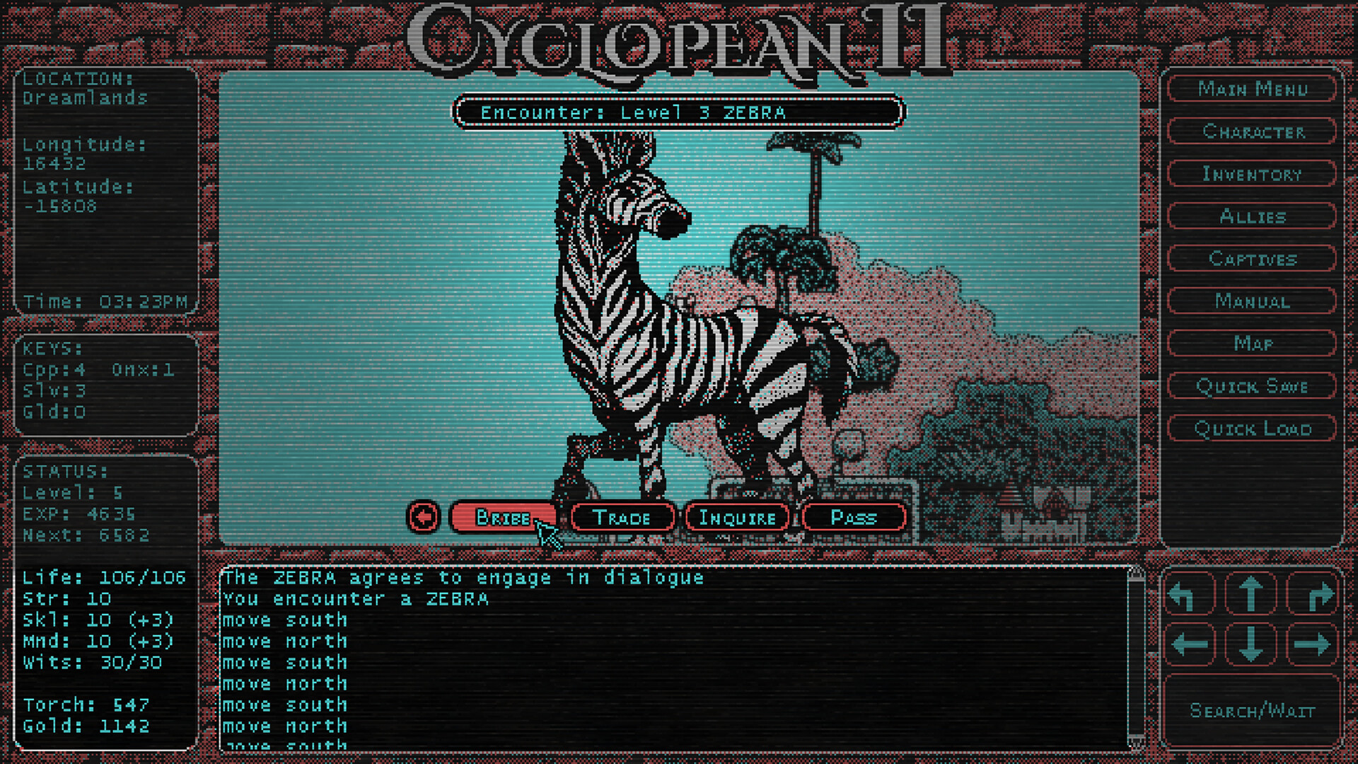 The first Cyclopean followed the tradition of early CRPGs like Ultima, Questron, and Legacy of the Ancients (among others) in that it presents two differing views of the game world.  Outside of dungeons, you see your character from the top down in a 2D display of the map.  Whereas, in dungeons, the view changes to a 3D, first person perspective. Cyclopean II continues this approach, and adds several cities: 2D areas which are more densely populated, separate from the main map.
