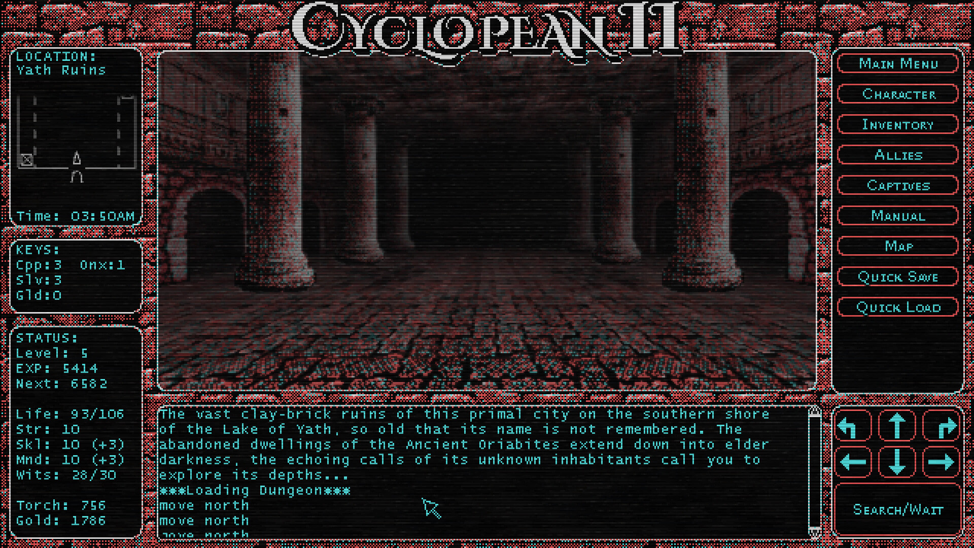 The first Cyclopean followed the tradition of early CRPGs like Ultima, Questron, and Legacy of the Ancients (among others) in that it presents two differing views of the game world.  Outside of dungeons, you see your character from the top down in a 2D display of the map.  Whereas, in dungeons, the view changes to a 3D, first person perspective. Cyclopean II continues this approach, and adds several cities: 2D areas which are more densely populated, separate from the main map.