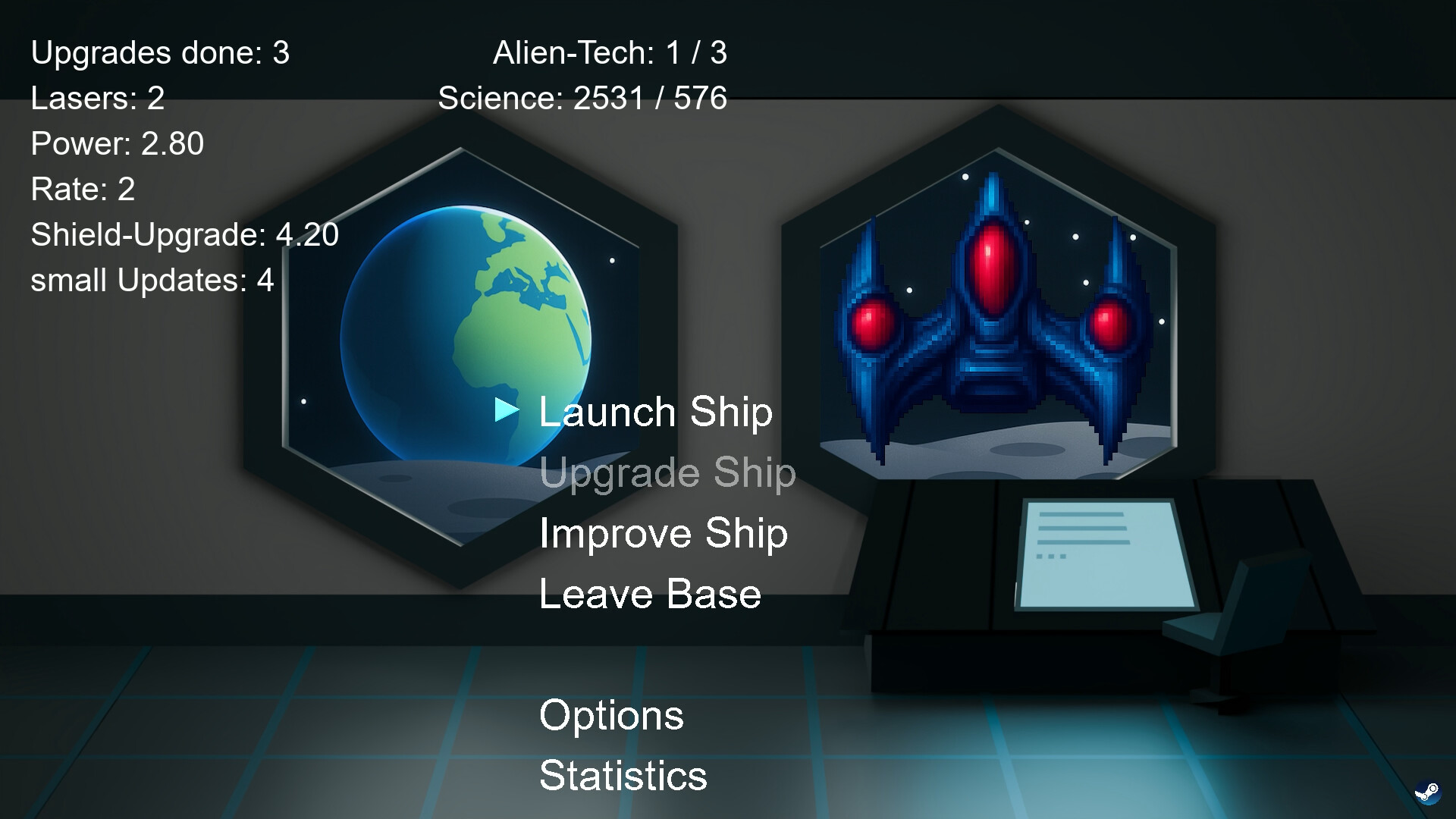 After your ship is destroyed, you can permanently upgrade it, provided you have collected enough alien tech. With each upgrade, the visuals evolve too – from 2-bit black and white, through retro styles, all the way to modern graphics – letting you relive the history of shooter visuals.