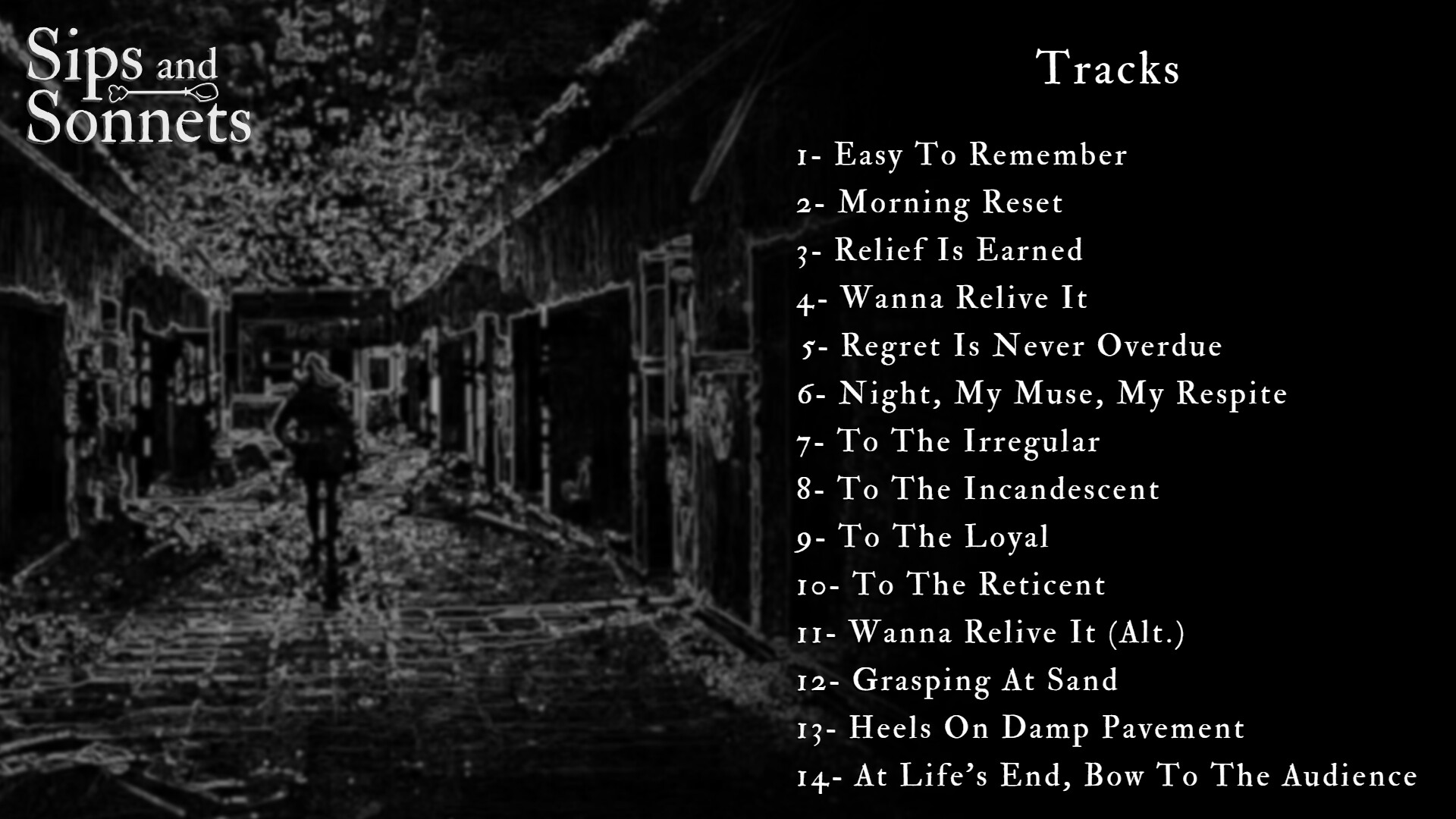 This guitar-and-piano collection was composed for Sips and Sonnets by Malik Zubailah, the composer and vocalist behind successful musical projects Skeleton Crowd, ana.n7n, and Statues of Sinking Men, the latter having accrued 1.2 million listens across various streaming platforms.