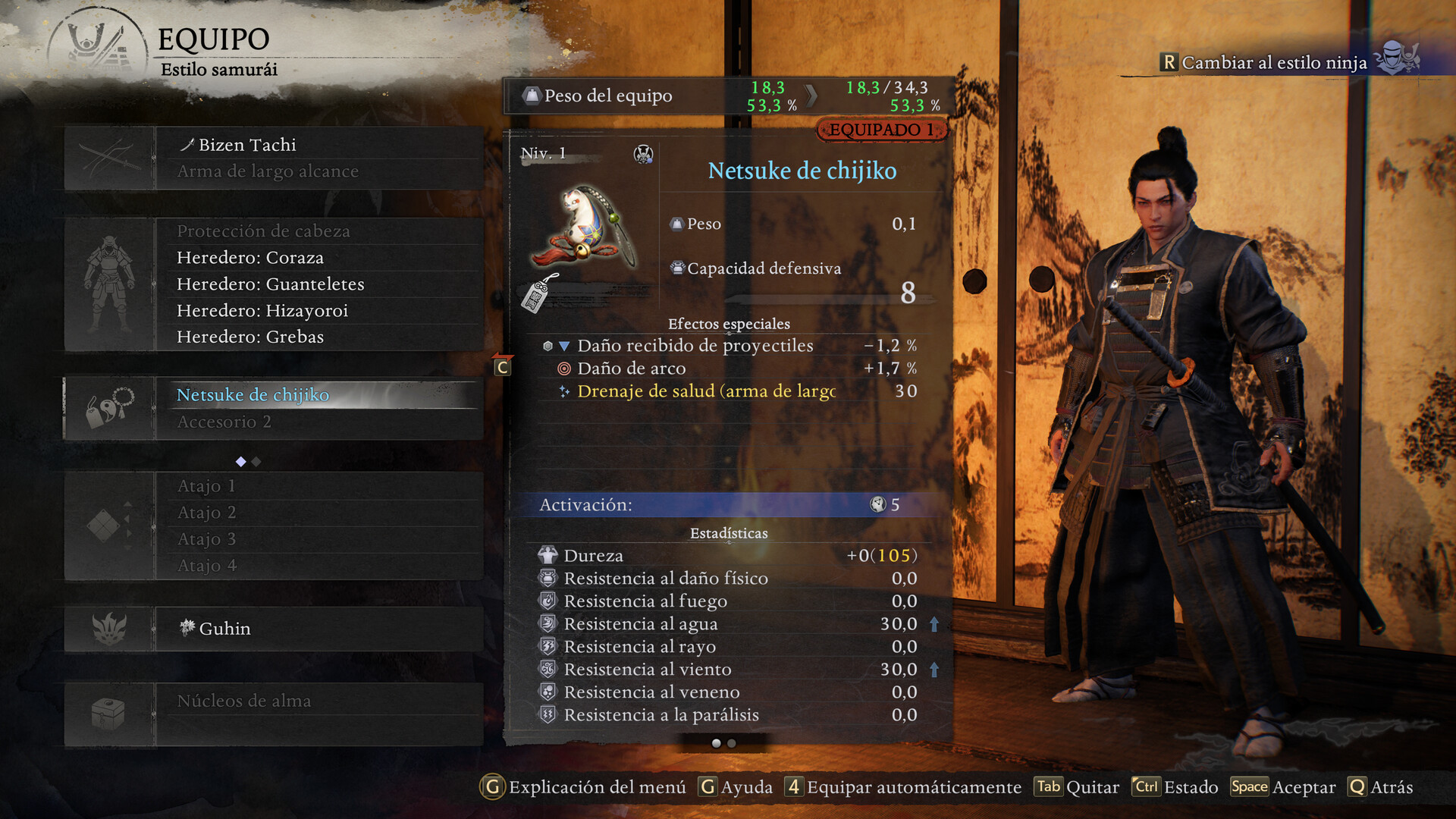 El accesorio Netsuke de chijiko, que podrás equipar en el juego. Incluye variantes para Estilo samurái y Estilo ninja.
