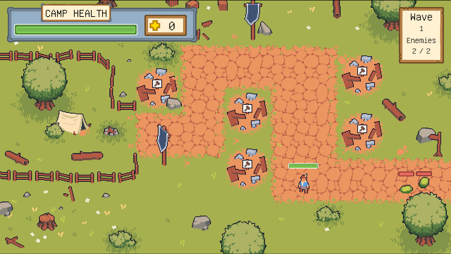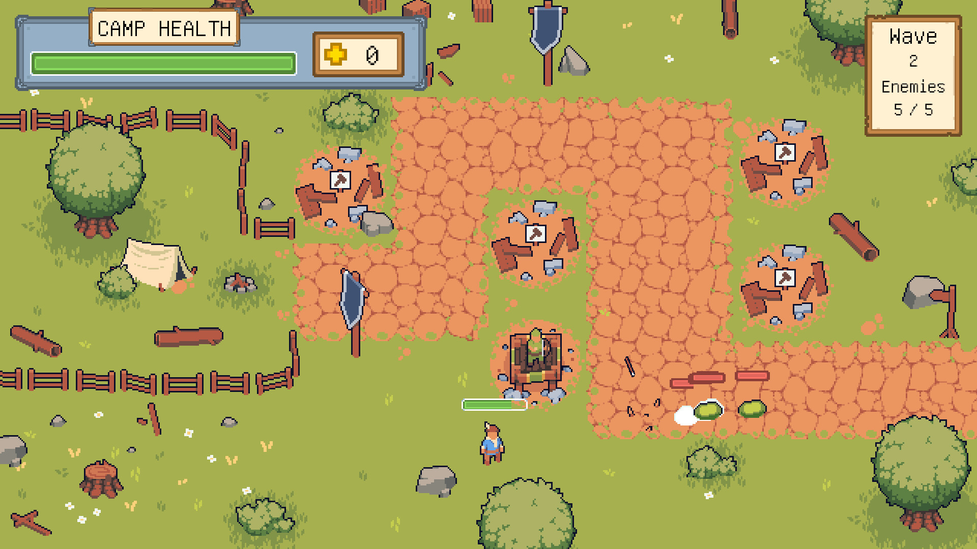 You are responsible for guarding a wilderness camp. For some reason, slimes from the grassland are swarming toward you. You need to build defensive towers, provide positions for archers, and survive the ever-increasing number of slimes. If too many slimes enter your tent, the mission fails.
