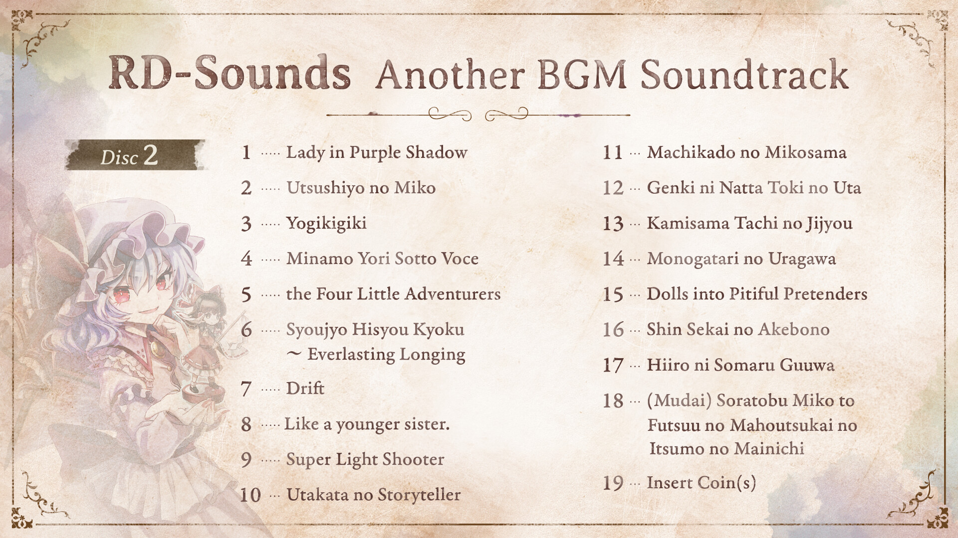 This is a soundtrack that includes music from the DLC『Marisa of Liartop mountain DLC: RD-Sounds Another BGM Pack Vol.1・Vol.2』