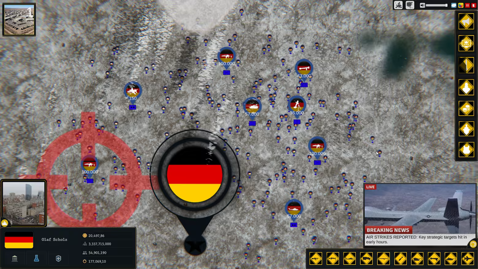 • Führe strategische Bombardements mit Flugzeugen und ballistischen Raketen durch.