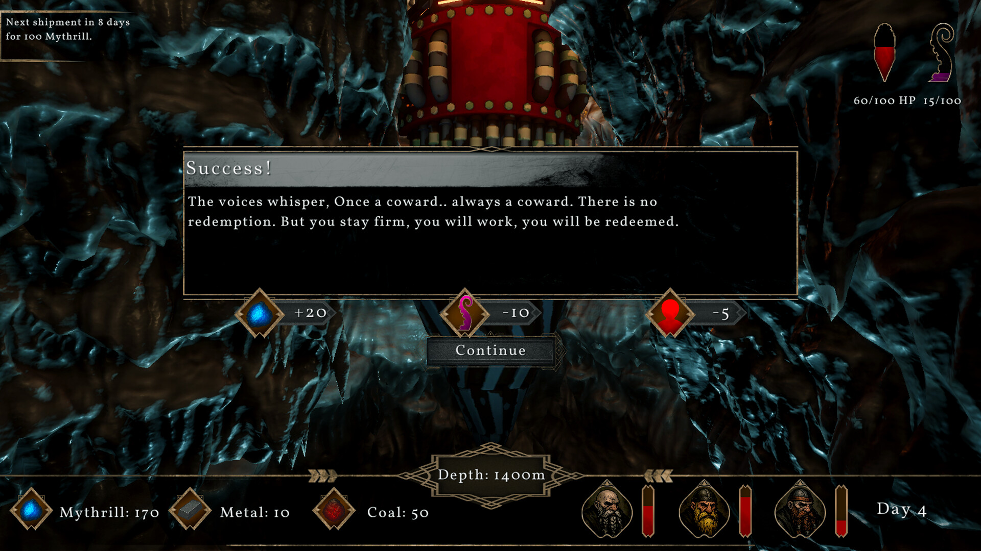 When you send dwarfs to events their stats will act as a modifier on the dice. Make strategic decisions on who you send as if their health drops too low or they go mad the outpost will be doomed.