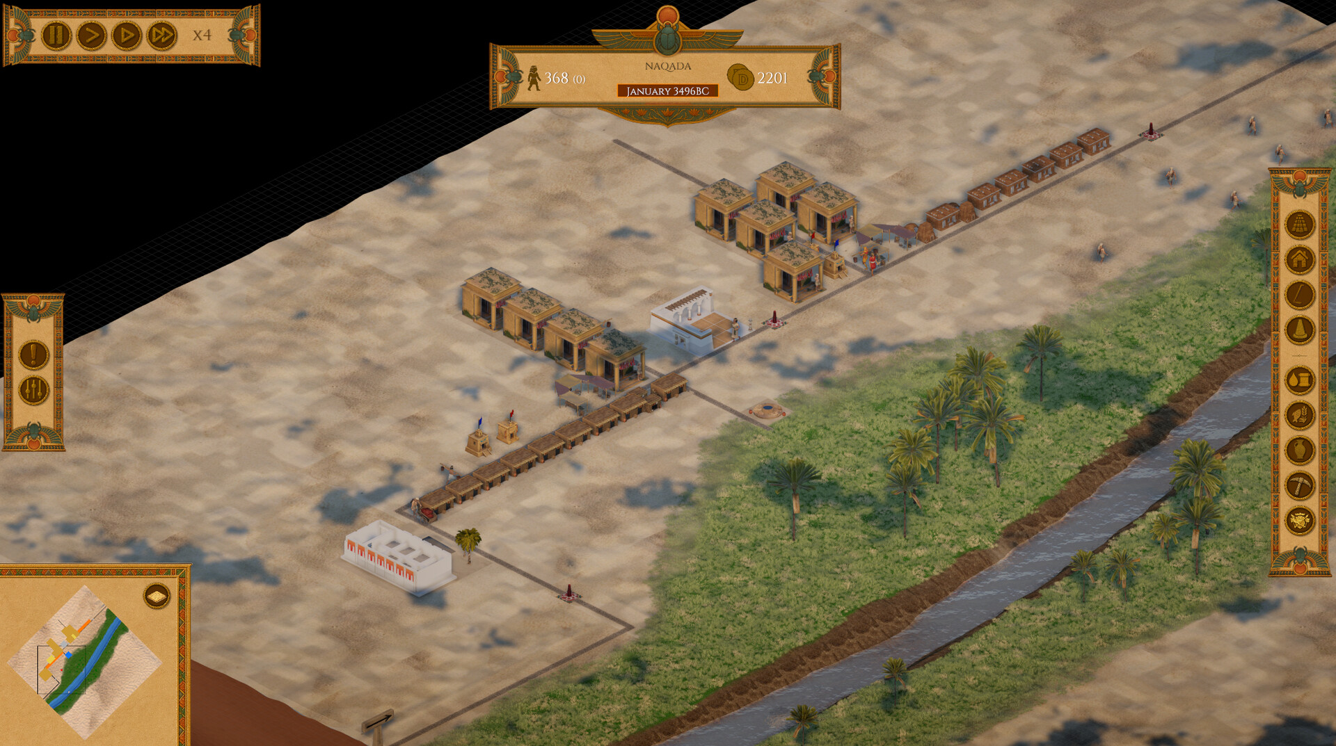 The current version contains the foundation of the city-building experience. You can lay roads, build houses, manage walkers, distribute food, supply water, place firewatch posts, handle basic hazards, and expand your settlement along the Nile. The game already supports construction, destruction, terrain flattening, and core resource movement. Early versions of farming, storage, and simple services are also present.