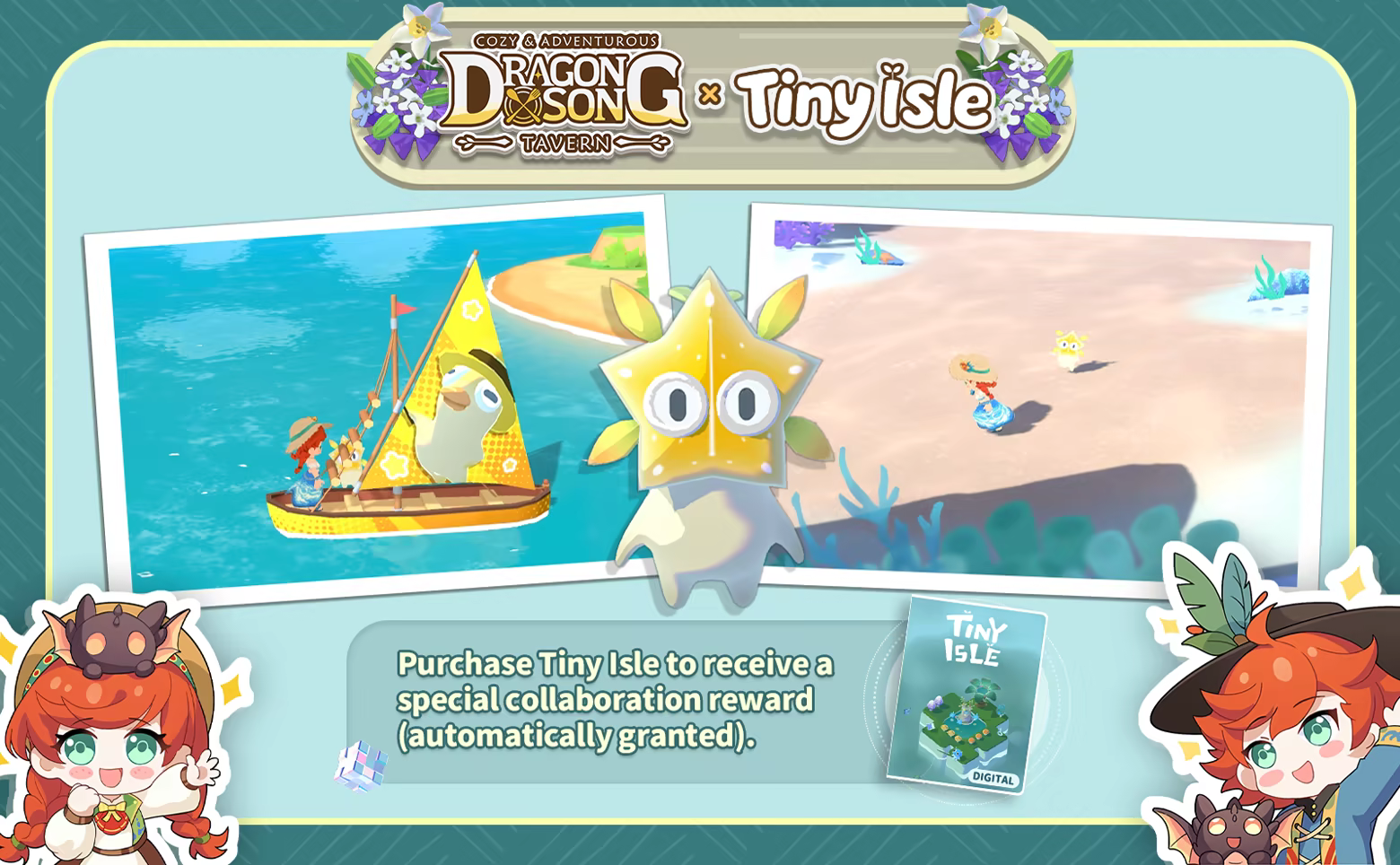 Dragon Song Tavern: Cozy & Adventurous × Tiny Isle: Adventurers who own Tiny Isle can launch Dragon Song Tavern and claim an exclusive Tiny Isle collaboration sailboat skin via the in-game mailbox.
