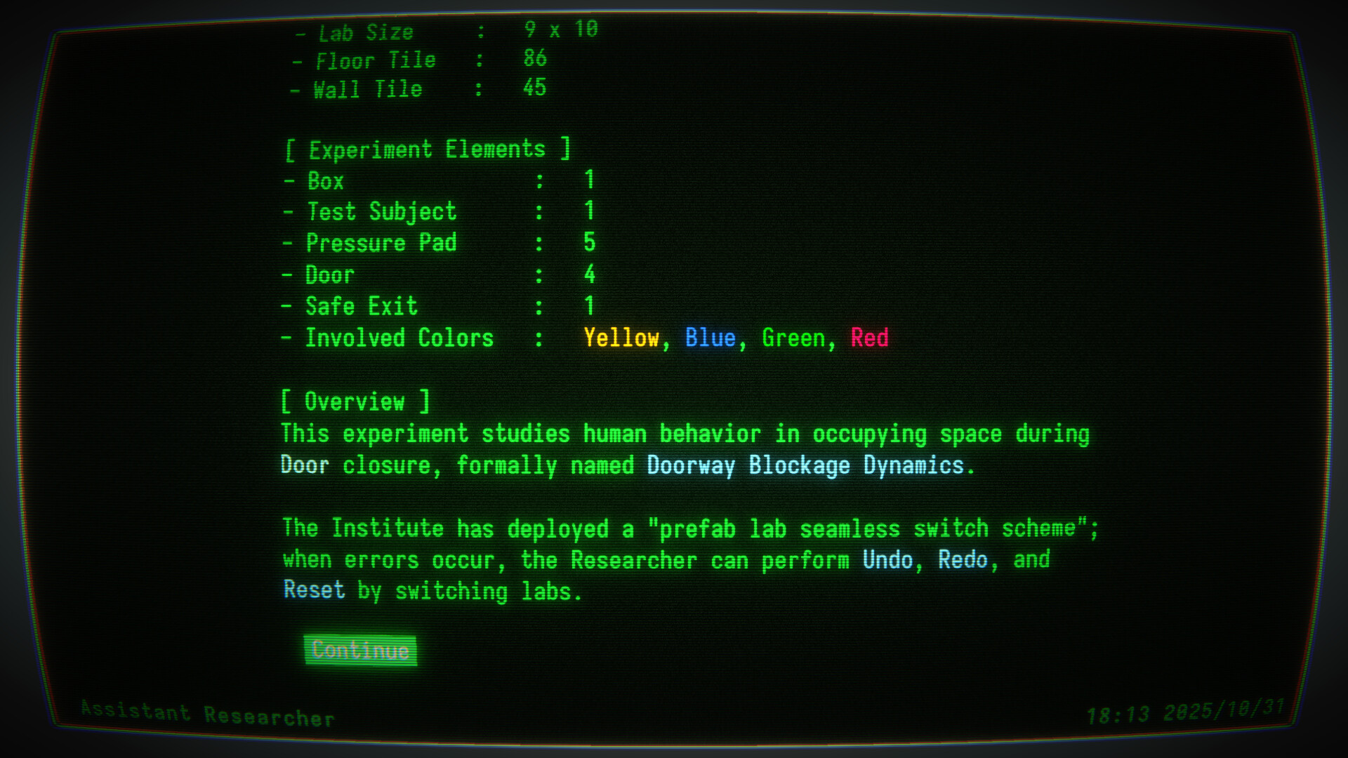 As a newly appointed intern researcher, you will operate an old CRT monitoring terminal to remotely command Test Subjects through a series of rigorous yet absurd “door control science” experiments.