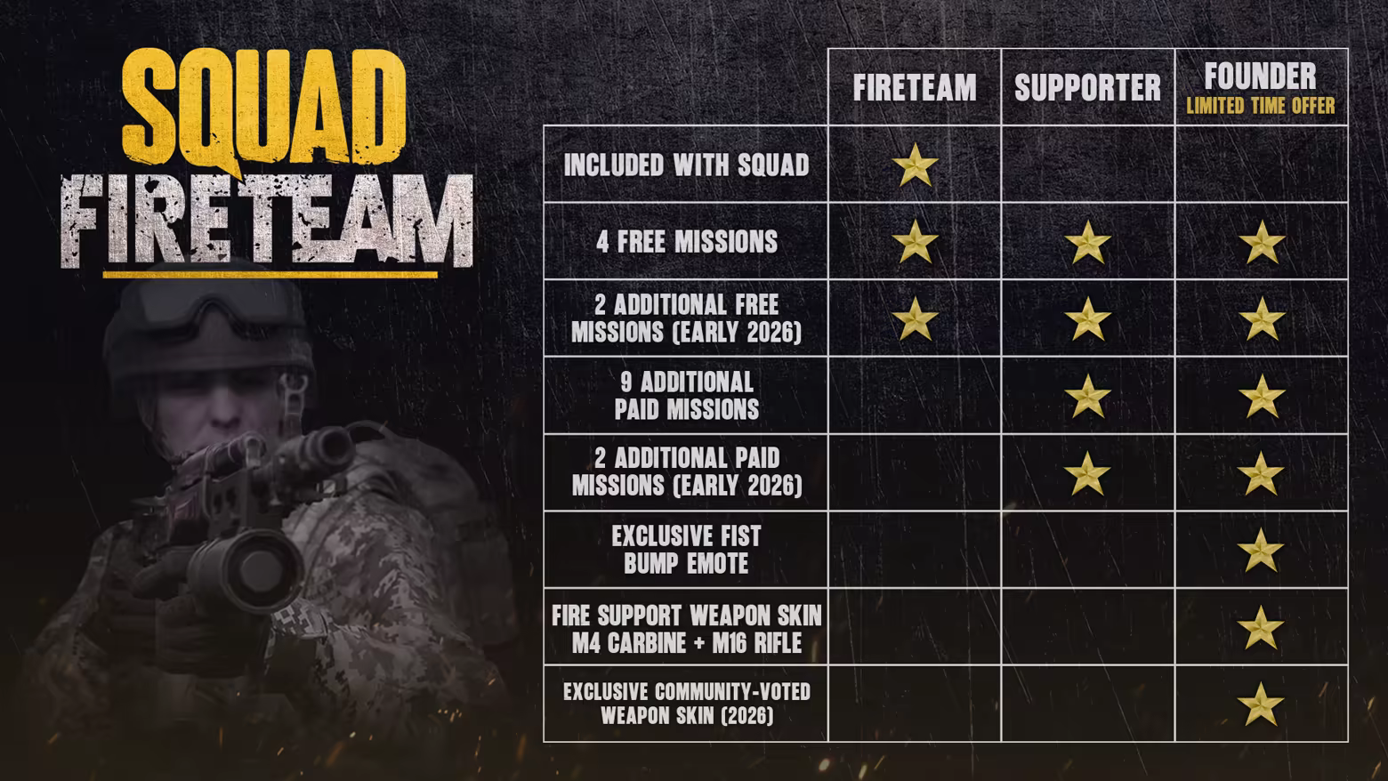 Like Squad, Fireteam will benefit from content updates throughout the year. Fireteam will continue to grow, with ongoing mission expansions, new tools and improvements for modders, community-created content, and a living roadmap shaped directly by your feedback. In addition to the four missions available to everyone at launch, the paid upgrades to Fireteam are as follows: