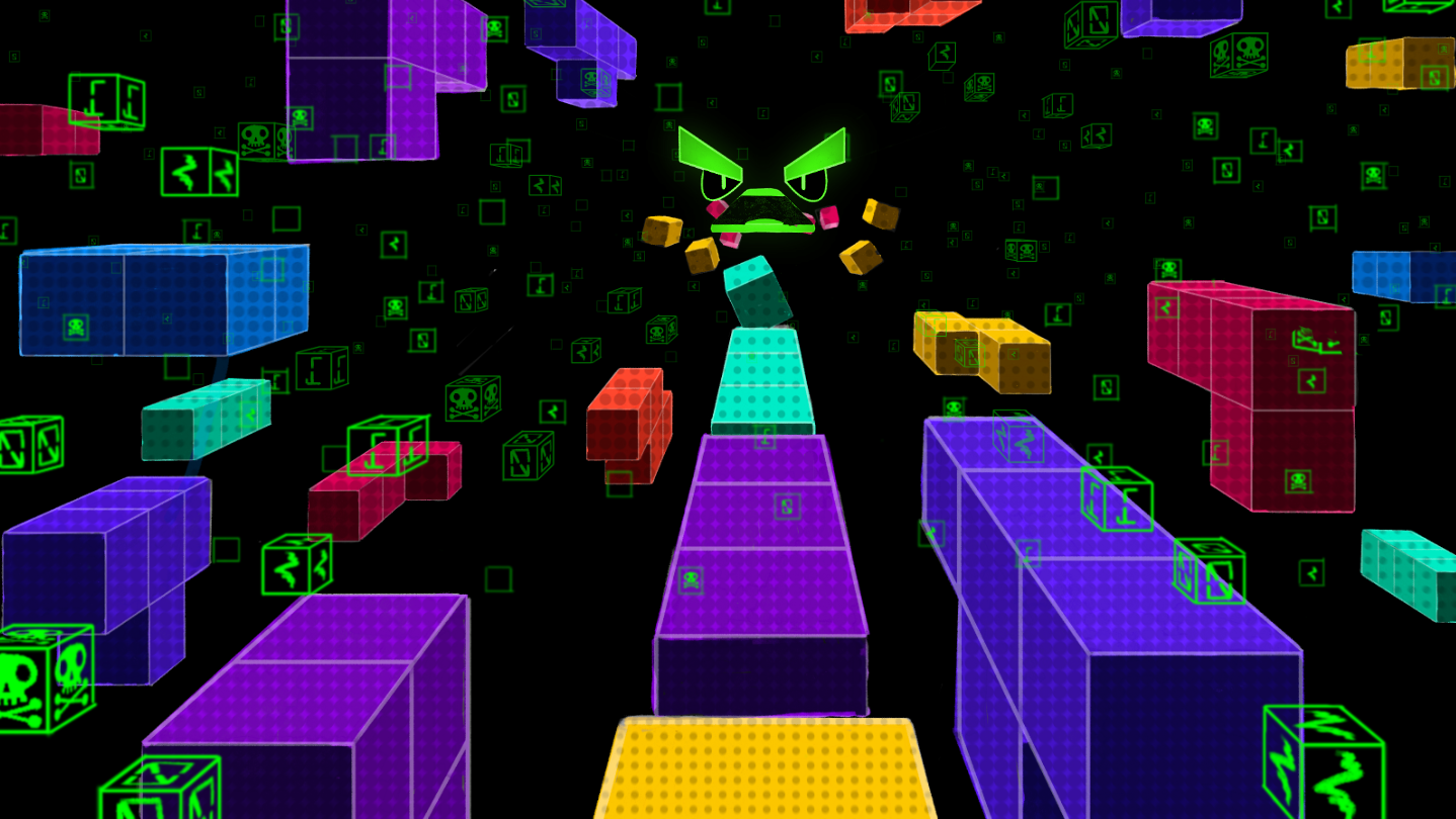 In an abandoned arcade a collapsed cabinet flickers to life. Sparks fly, the cracked CRT crackles and hums. Within the fallen machine a binary corruption takes hold. A rogue block runs for its life to avoid being consumed by the collapsing codebase.
