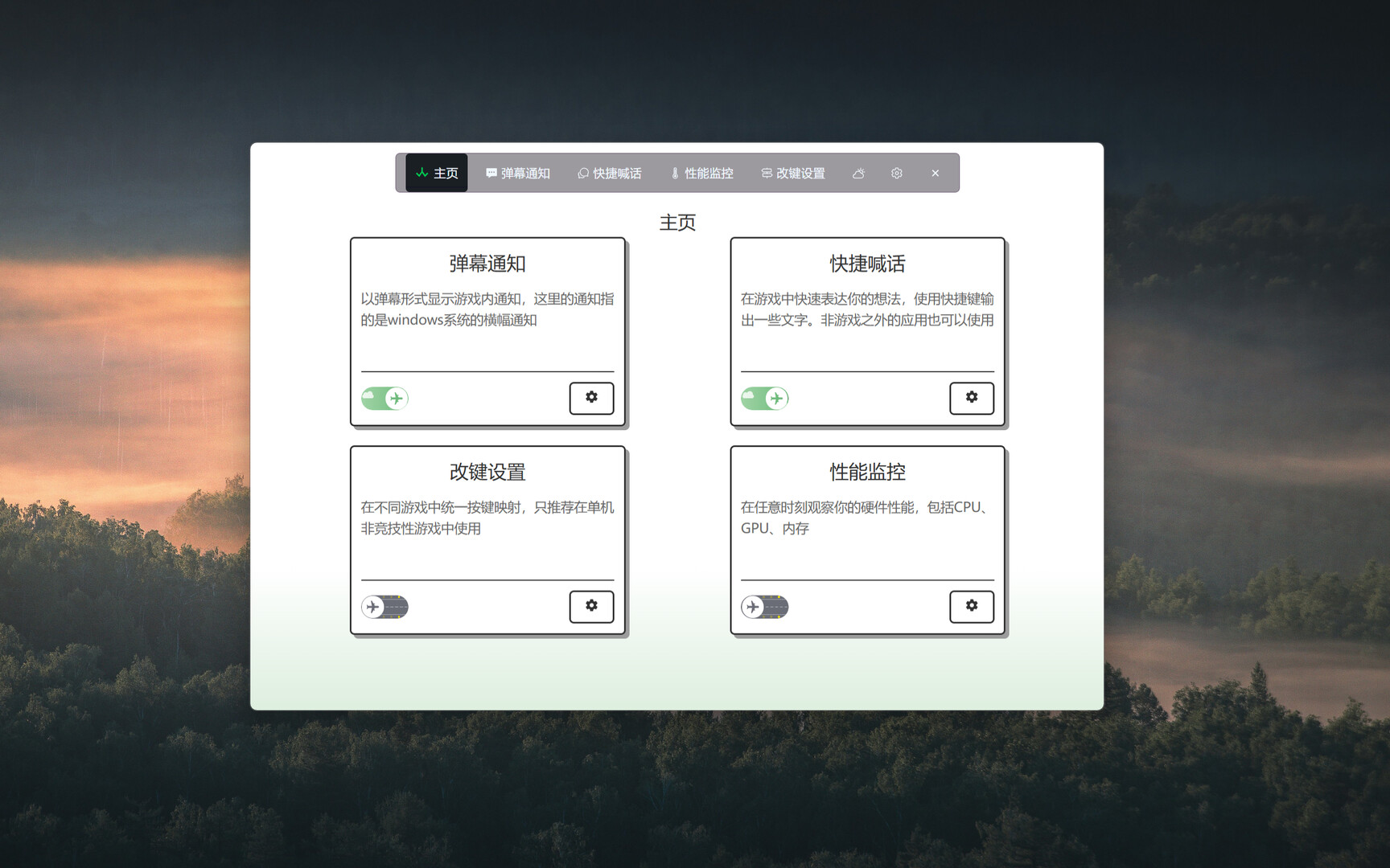 你是否在打游戏的时候被这些问题困扰: 非常想看通知的内容,但是不想打断游戏;有时候非常想把一些话告诉对友与对手,但是打字不够快;能有个轻量化的监控软件,在游戏中也能看到自己电脑的表现;许多种游戏,可以用一套键位。那么,这个工具就是给你准备的。
