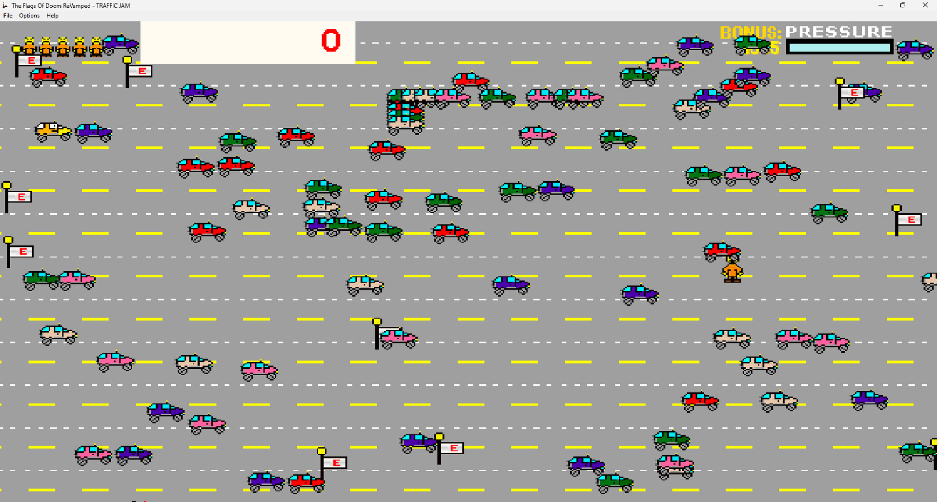 Flags of Doom is a classic 1-screen retro platformer, with a few puzzles baked in. You are Ed, the 3rd or 4th last hope of planet Happyville. You must destroy the evil Space Fish by placing hundreds of tiny bombs over 100-120 stages of increasing difficulty.