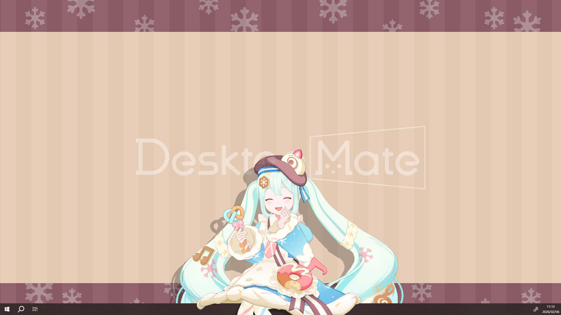 Snow Miku appears each year with a brand-new design. The 2026 theme is "Shiawase Pâtisserie" (Happy Pastry Shop). Adorned with musical notes, snowflakes, and sweets, she sweetly decorates your desktop. This DLC features all-new motions throughout, with every gesture and movement exclusive to this version—completely different from the standard Hatsune Miku.
