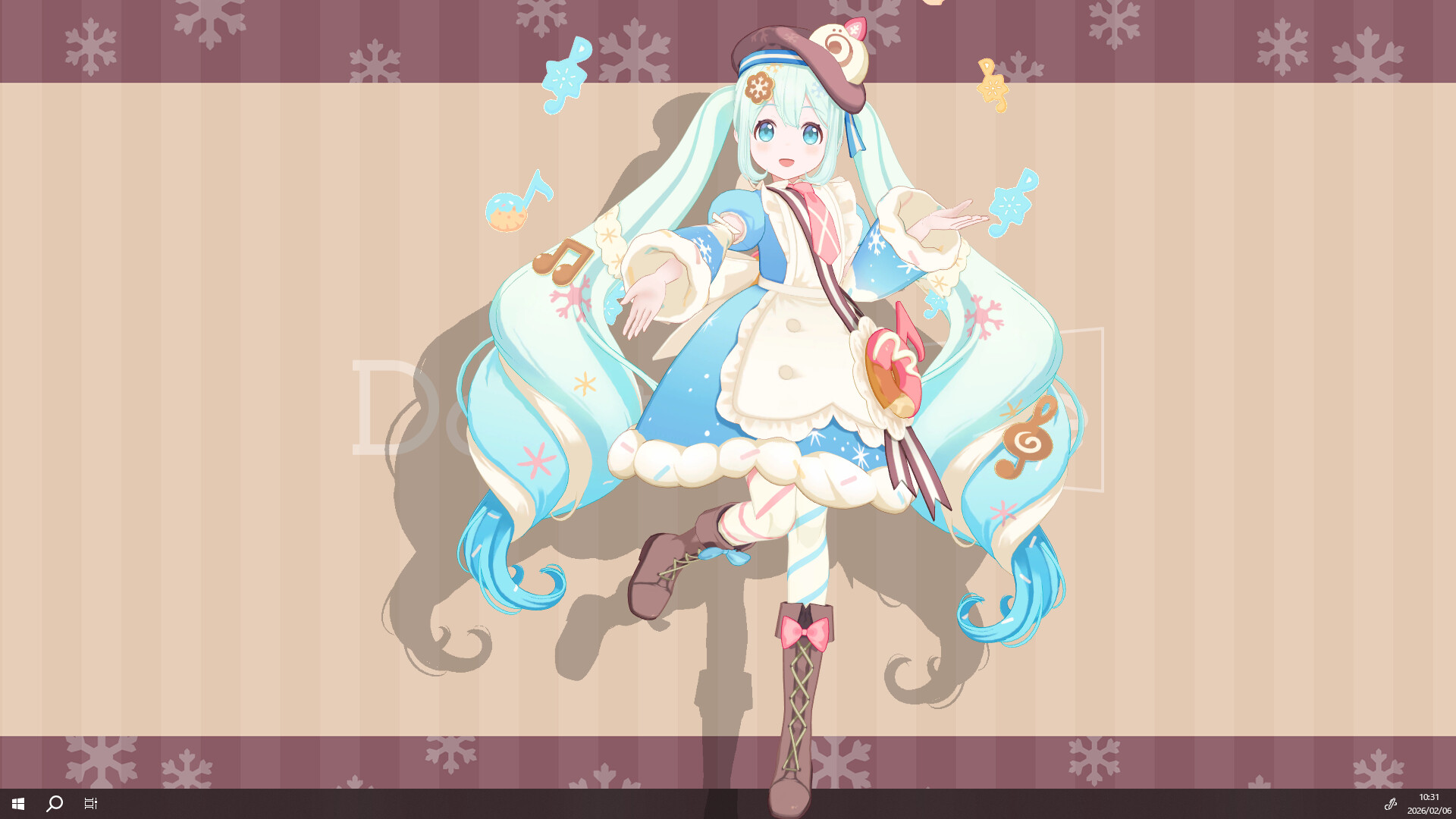 Snow Miku appears each year with a brand-new design. The 2026 theme is "Shiawase Pâtisserie" (Happy Pastry Shop). Adorned with musical notes, snowflakes, and sweets, she sweetly decorates your desktop. This DLC features all-new motions throughout, with every gesture and movement exclusive to this version—completely different from the standard Hatsune Miku.