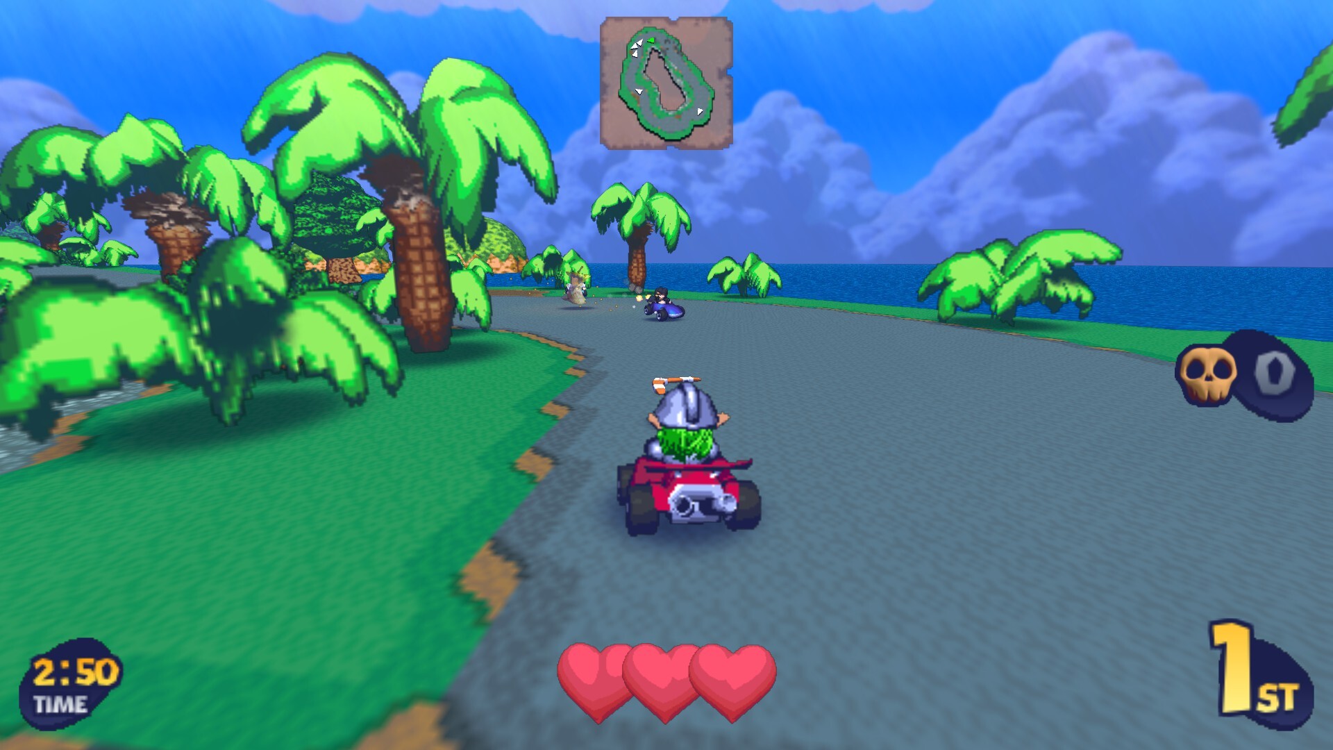Reminiscent of games from the 32 bit era - 3D tracks with pre-rendered billboard sprites. Easily add (not replace) your own character skins through included modding resources.