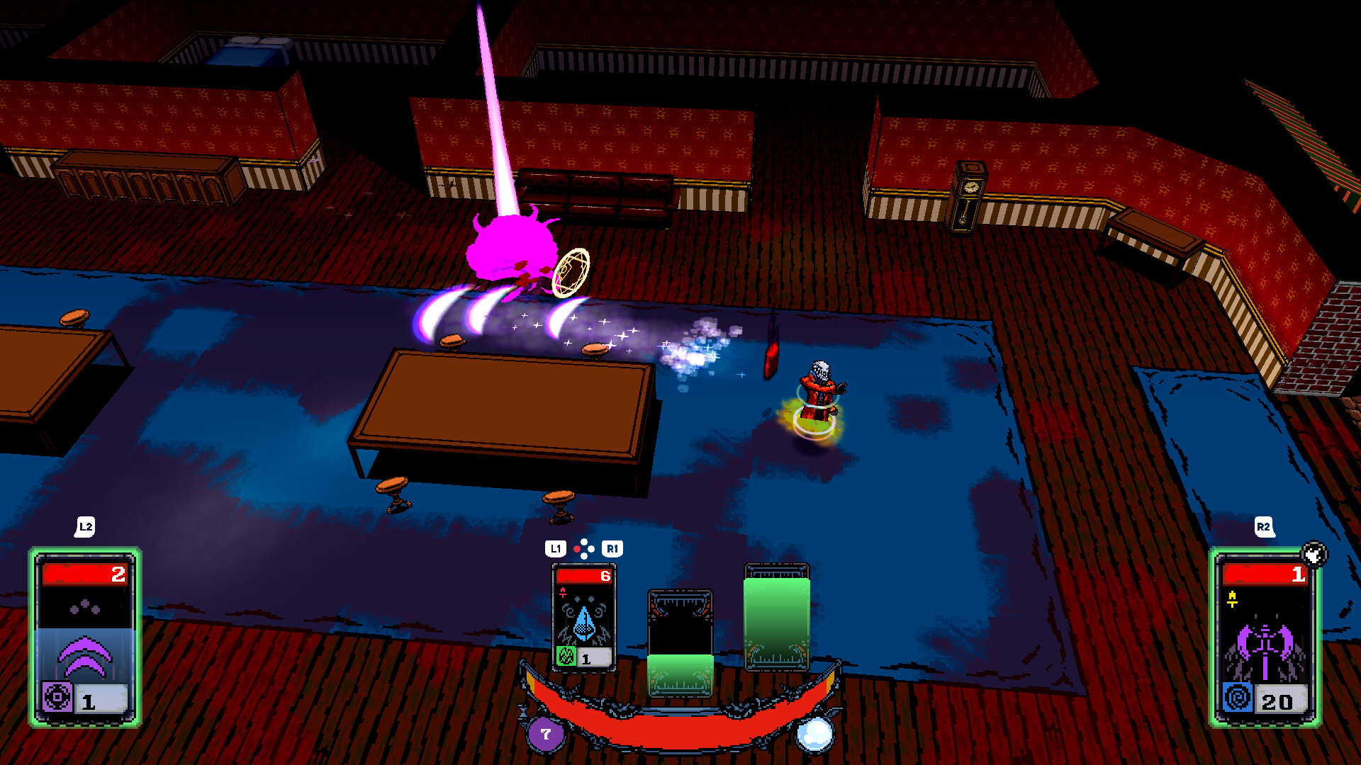Slaughter hordes of enemies in fast paced twin-stick shooter combat! Pull spells from your deck and exploit enemy weakness to generate enough energy to keep up the pace!