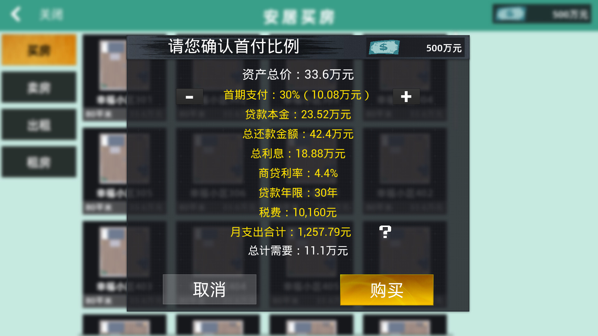 - 房产相关:买房(支持贷款,首付比例自选)、卖房、租房、出租房子。