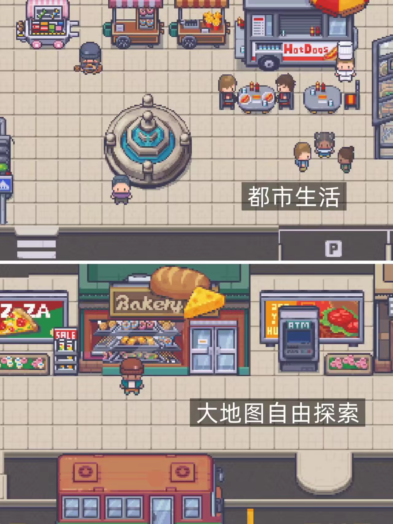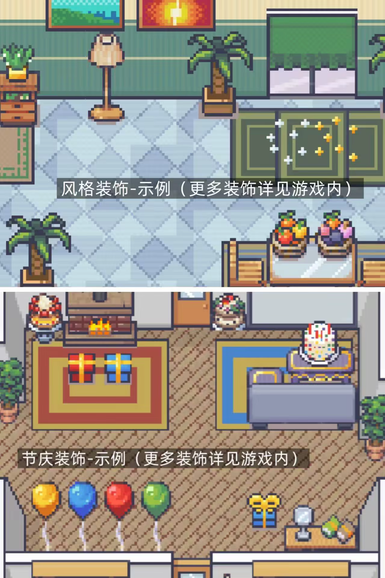 • 探索与社交: 自由探索充满生活气息的像素风小镇,拜访城市公园、农场、各色店铺、露营地等十多个场景,并与其中形形色色的居民相遇和互动。
