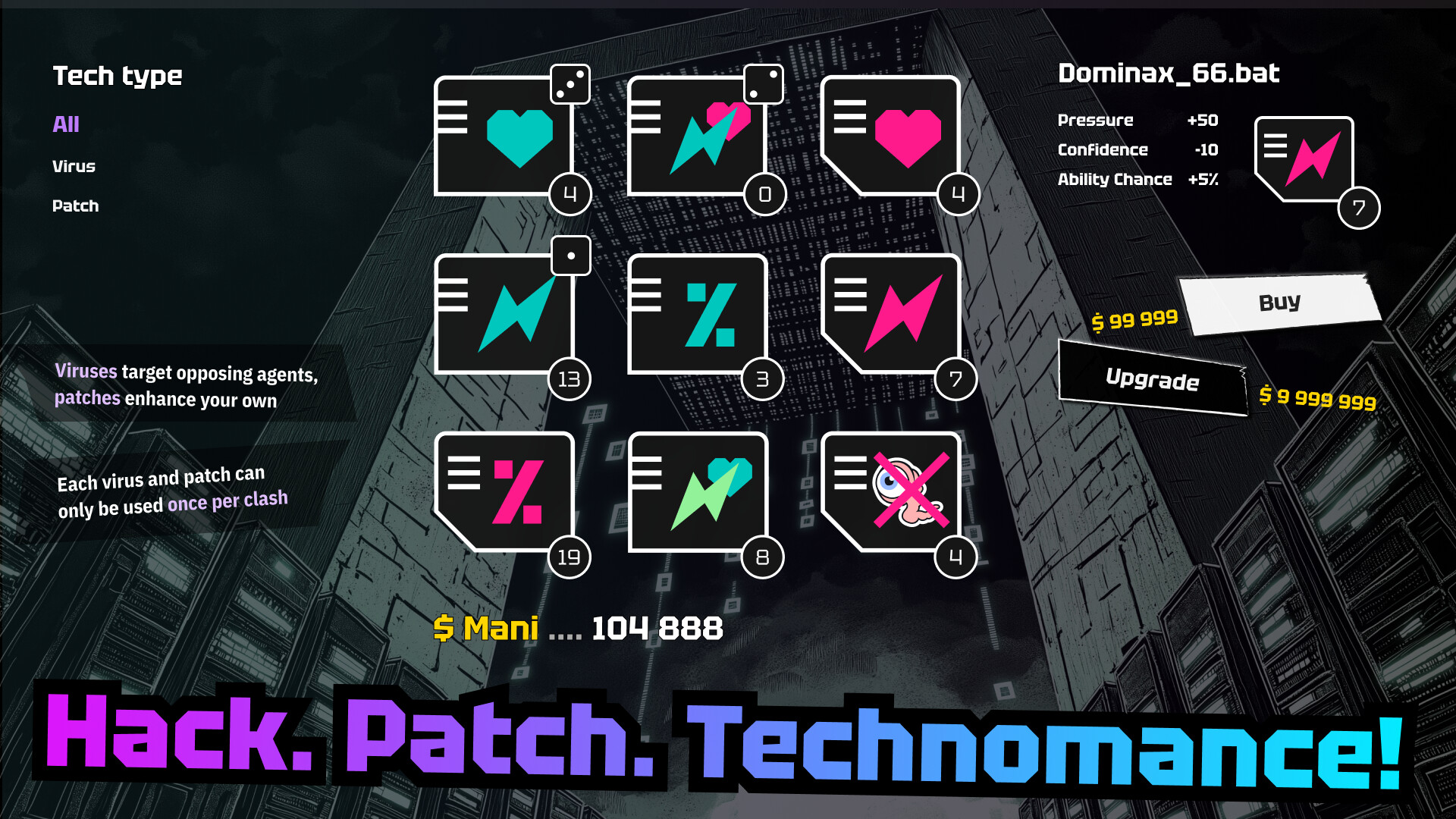 Unleash viruses and patches mid-fight. Hack enemy gadgets to cripple them or patch your own to survive. In this world, code is the only magic.