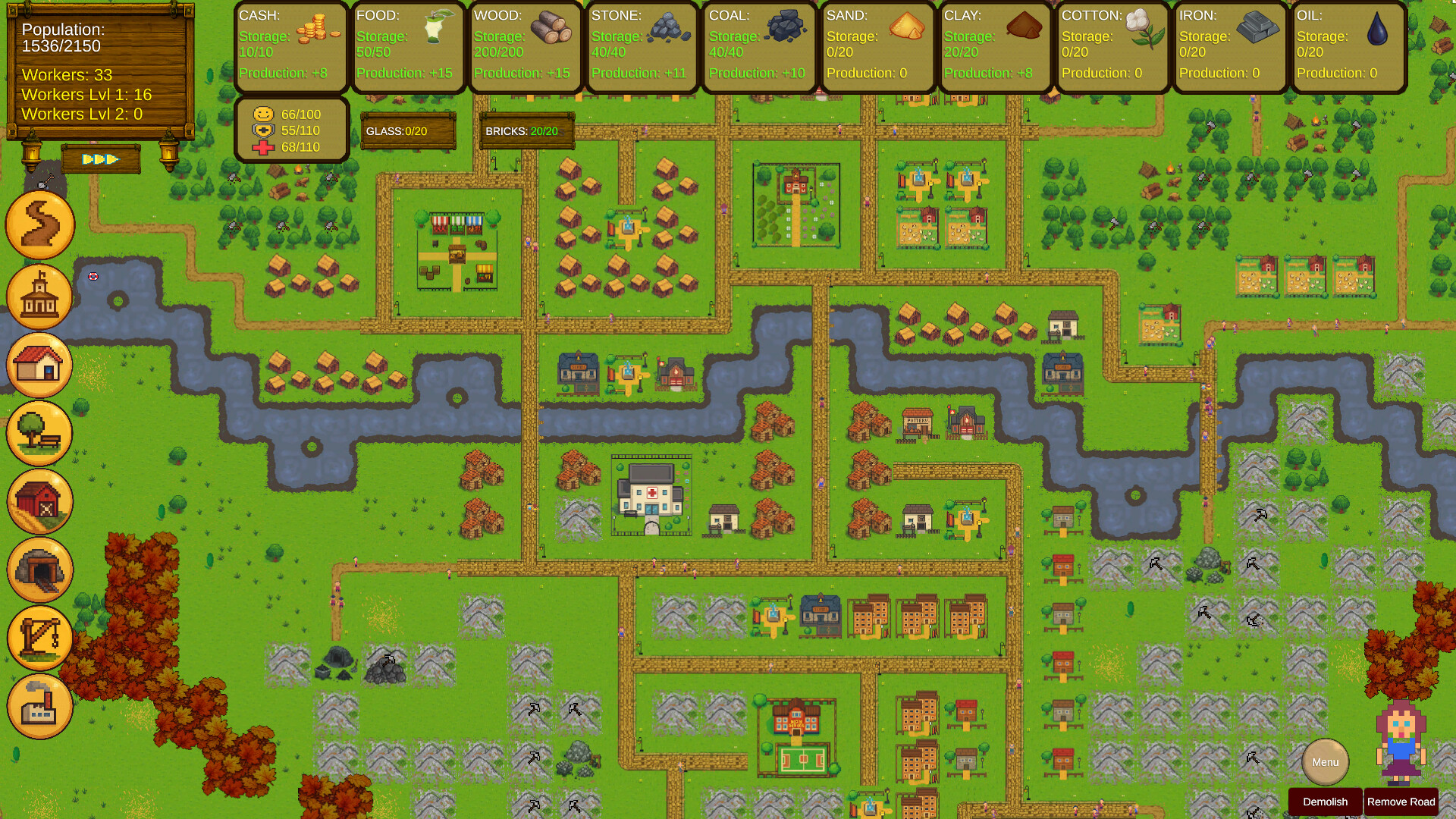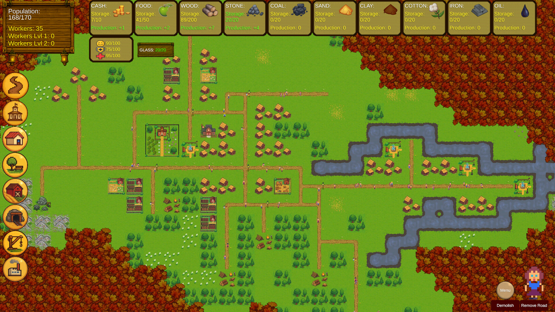 Manage over 20 resources gathered from your towns spread across an endless, randomly generated map;
