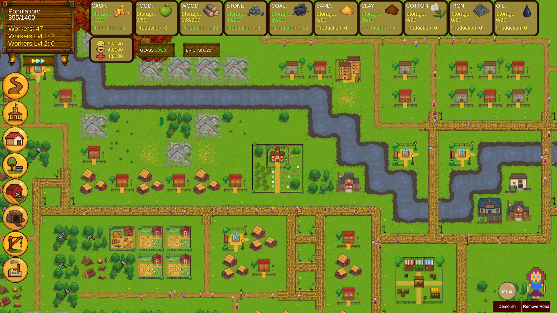 Manage over 20 resources gathered from your towns spread across an endless, randomly generated map;