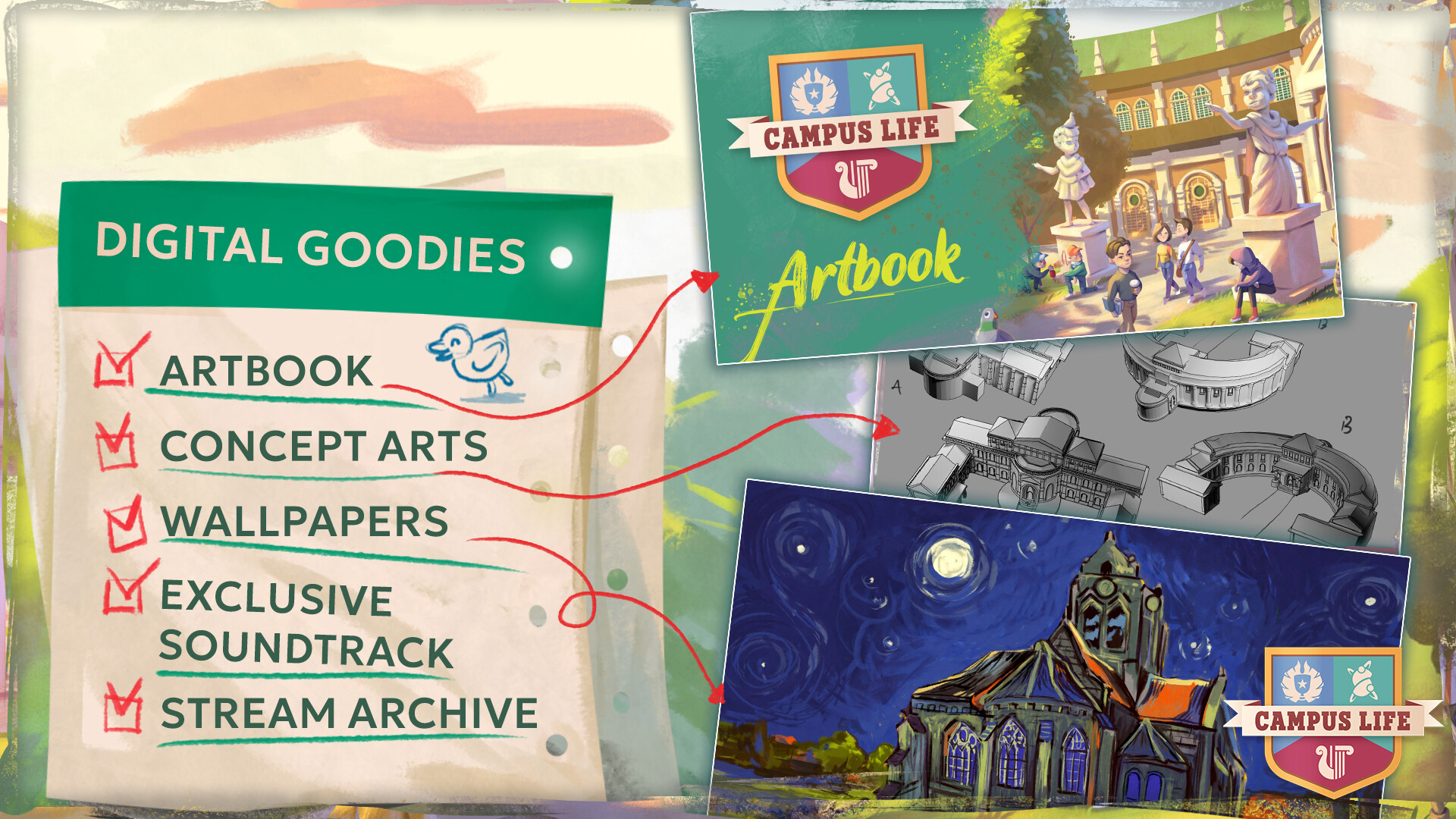 Artbook nabízí pohled do zákulisí, ukazuje skici, koncepty a rané návrhy, které formovaly svět Campus Life. Soundtrack přináší směs klidných i energických skladeb, odrážejících různé okamžiky studentského života – od studijních seancí až po společenské akce. Součástí balíčku je také výběr tapet, díky nimž si můžete vzít kousek Campus Life s sebou i mimo hru.