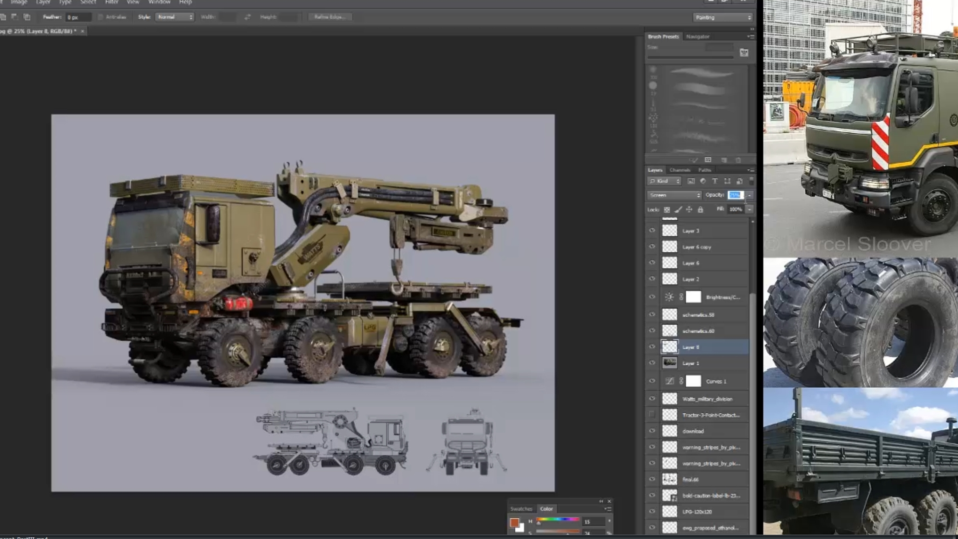 In part I of this tutorial I build the base of the truck in Zbrush using references and discuss hard surface techniques and various tricks used in the pipeline for look development. In part II of this tutorial I add a hookloader to the back of the truck and continue adding other details in Zbrush. I discuss my decisions and strategies regarding design and explain my thinking process when building realistic mechanisms. In part III ( the final part) of this tutorial I talk about texturing and rendering in Keyshot 5 and finalizing the image in Photoshop.