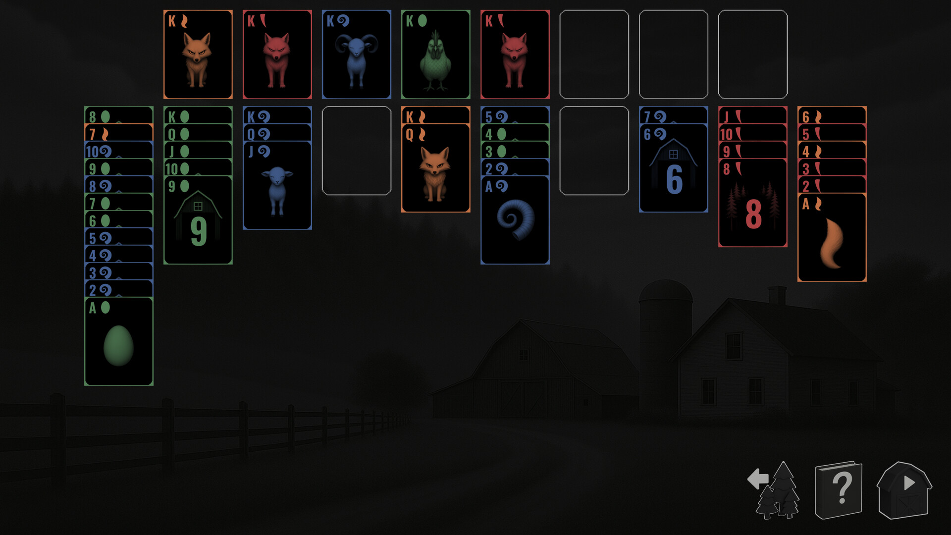 🐑 Farm Commotion - Spider solitaire under a restless night sky. The suits are wolves, foxes, chickens, and lambs, each stirring in the moonlit fields as the farm comes alive after dark.