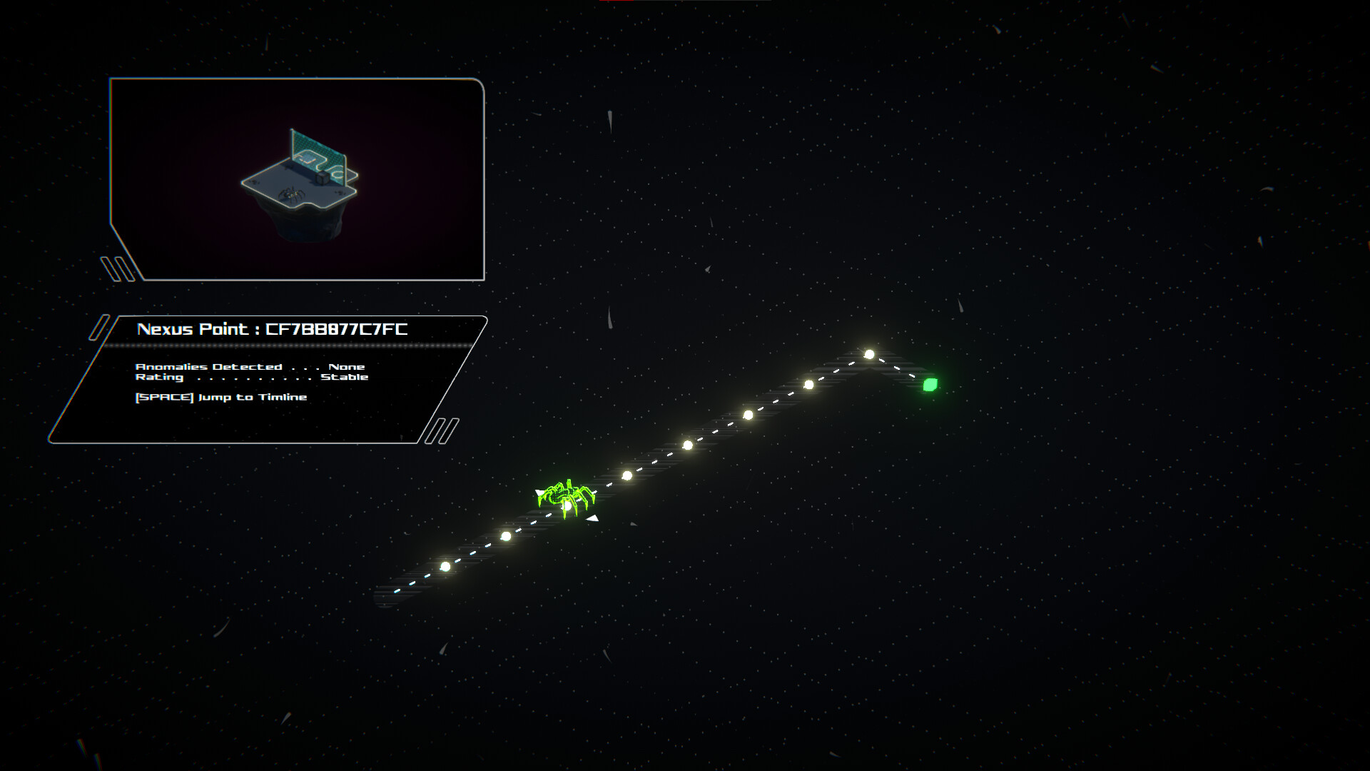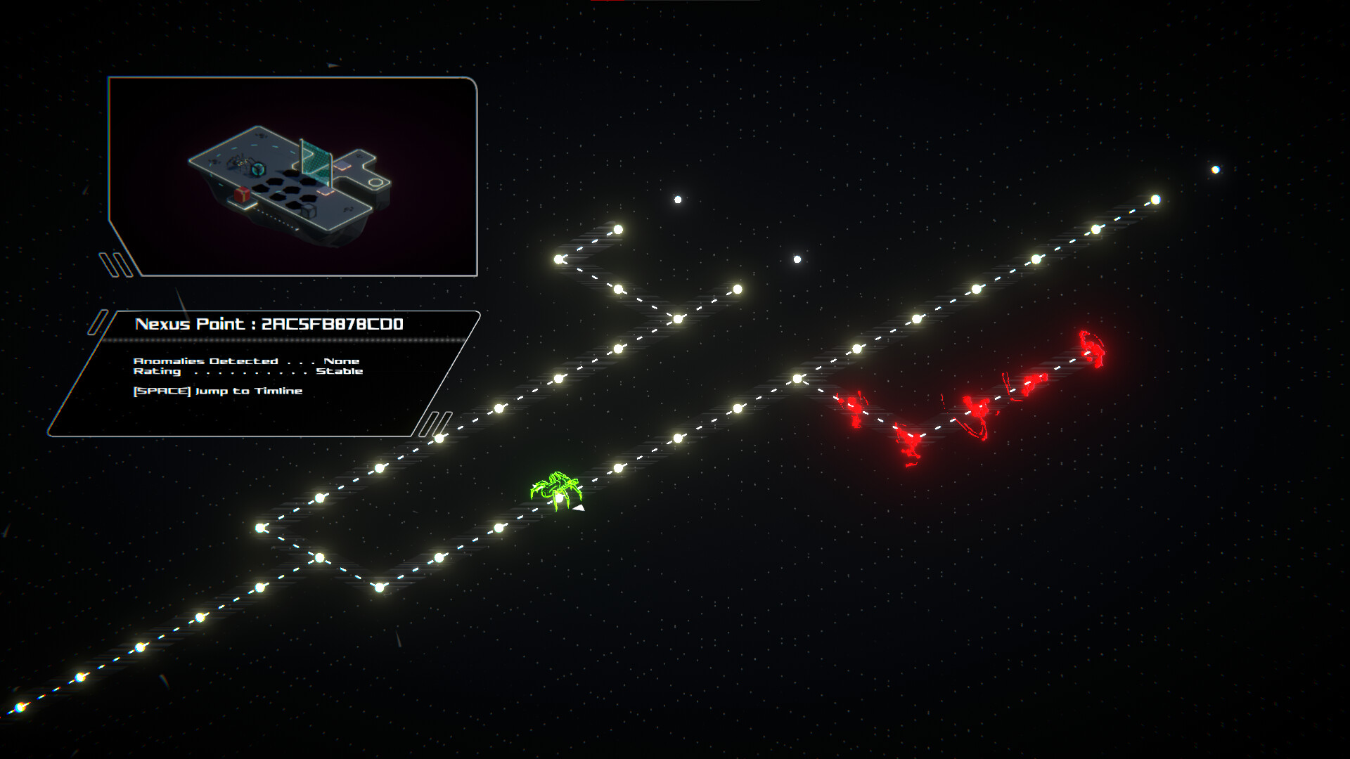 The Nexus, a pocket dimension crafted by Greenfang's creators, allows you, as the pilot, to access the different branches. Each Nexus Point is a discrete node, a sub-universe, containing a puzzle for you to solve. With 4 distinct timelines, be careful which paths you explore and which timelines you choose to corrupt.
