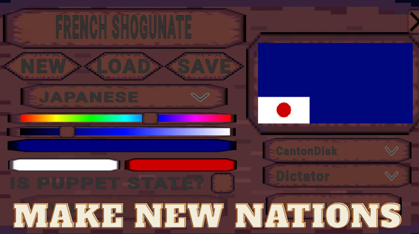 The player has the ability in game to make custom worlds whether there realistic or almost like specific small maps used for things like nation battle royales the player has the ability to make custom maps built of Provinces basically small pieces of custom territory that act as the building block of making the custom worlds which in game nations will be able to inhabit, develop and conquest
