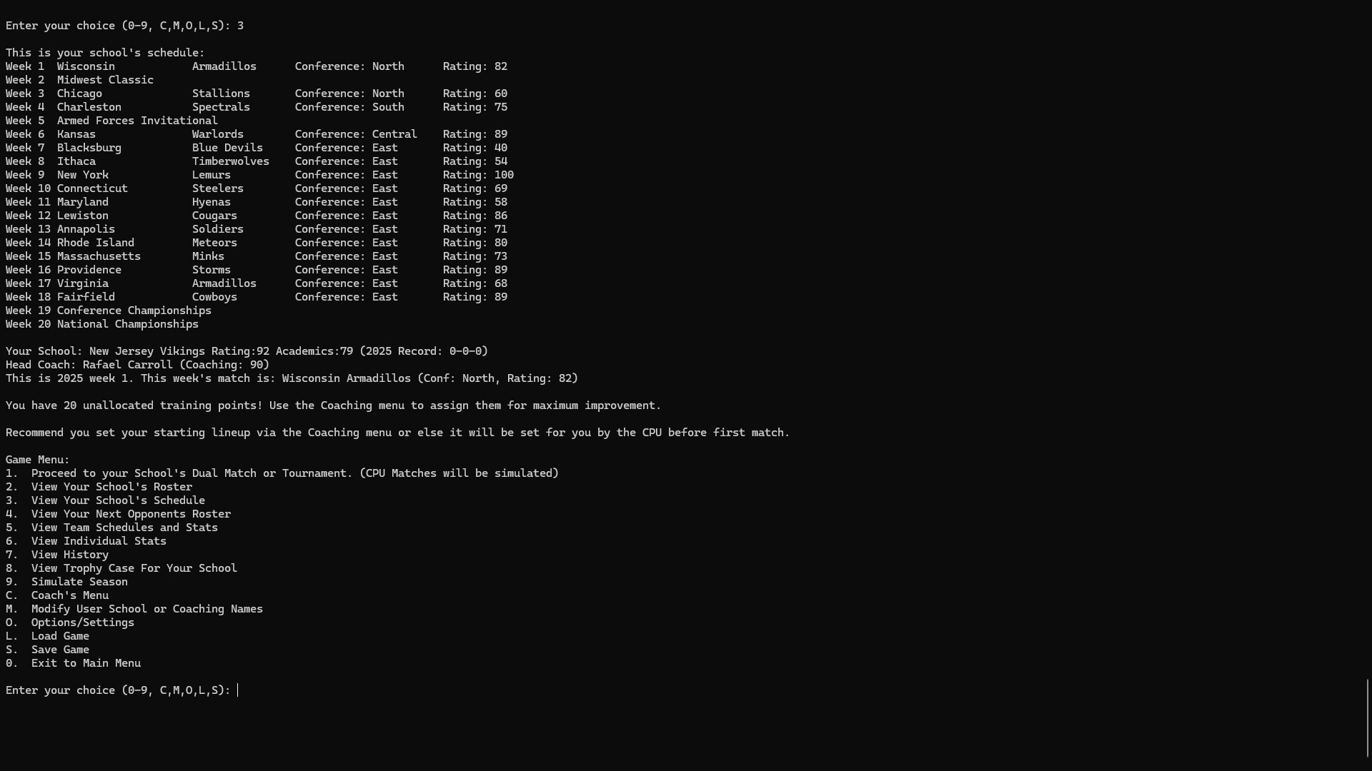 Text based only college sports game.  Take control of your favorite college or university's wrestling program.  Make program decisions to place the best roster on the mat possible to win a collegiate championship.  Recruit new wrestlers to improve the program year after year.