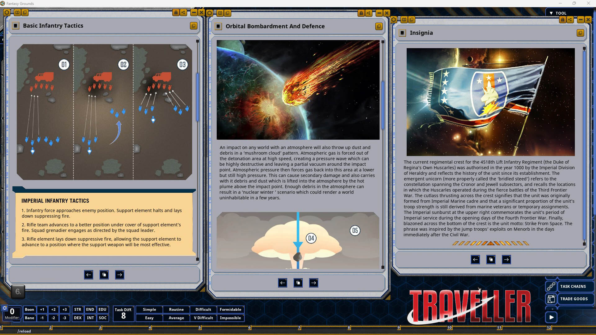 Requires: The free Fantasy Grounds virtual tabletop (VTT) software and a one time purchase of the Traveller 2E (Mongoose) ruleset.