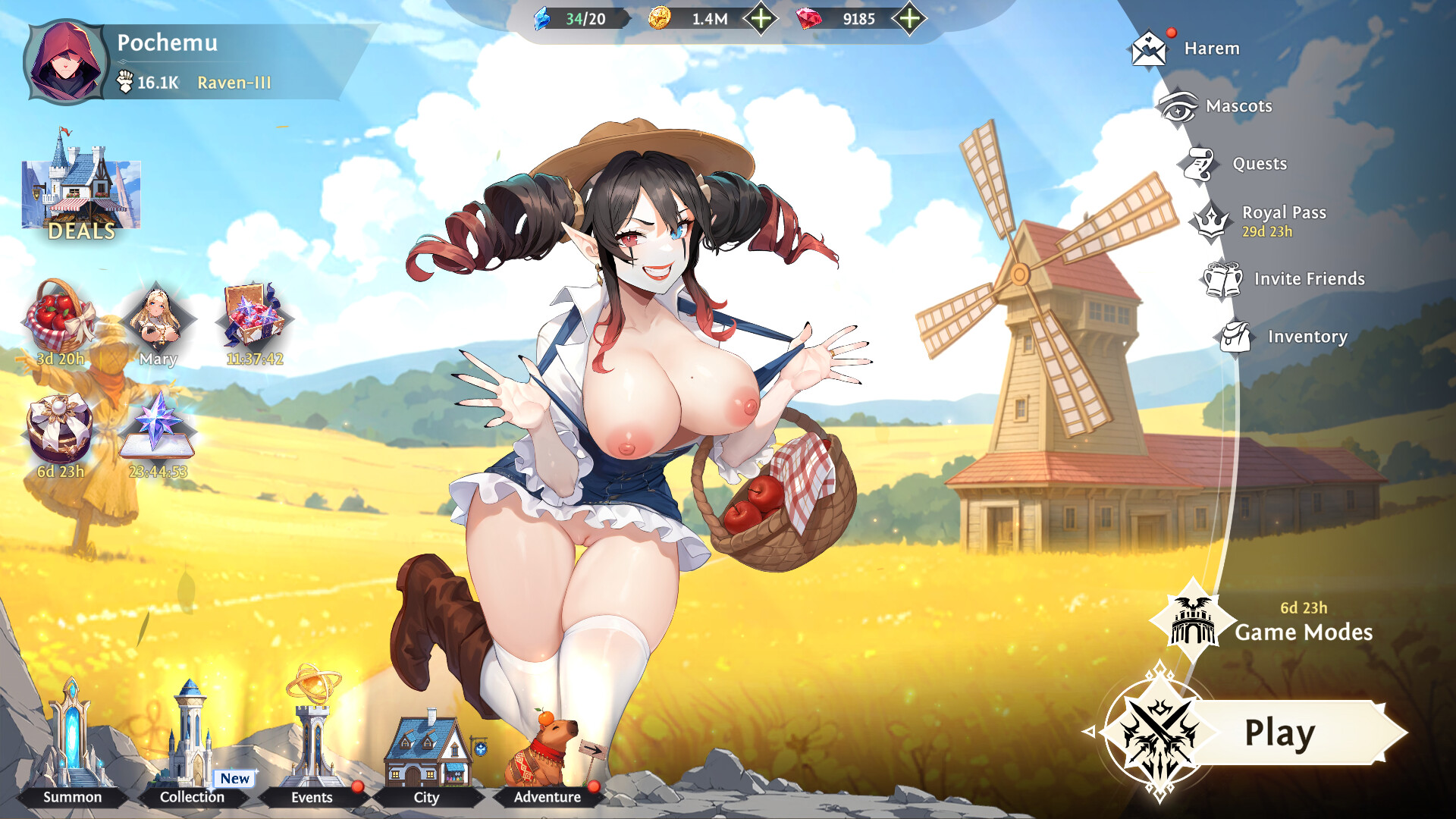 She draws attention to her bountiful harvest with breathtaking acrobatic performances. Her flexibility knows no bounds! And when she dances without a stitch of underwear... well, the spectacle is unforgettable! After the show, she loves to hide in the haylofts and startle unsuspecting farmers. And if you catch her eye, she might just whisk you away... for a little midnight mischief!