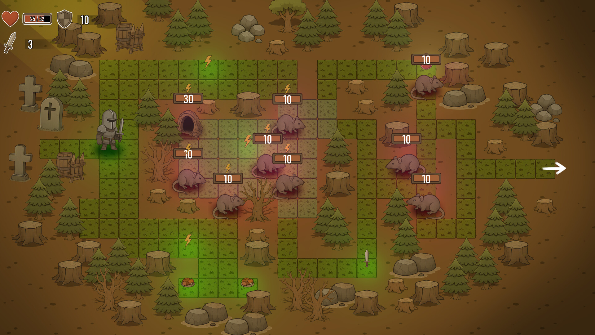 The game is an adventure in which you have to navigate through cells and fight enemies using logic and a sharp sword. Don't forget to select improvements that will help you advance. Food heals, potions increase the maximum amount of health, swords increase damage, and if you can find shoes, your character will start moving faster.