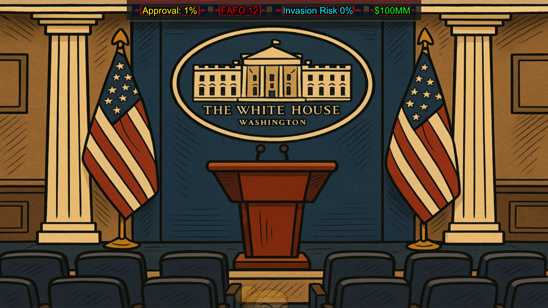 F around and find out! A ruthless no F's given dark comedy where you play the president of the United States of America, abuse executive power, crank up the FAFO meter, deal with robot overlords, alien invasions, drain swamps, flip off allies, crush protests, and destroy all that oppose you!