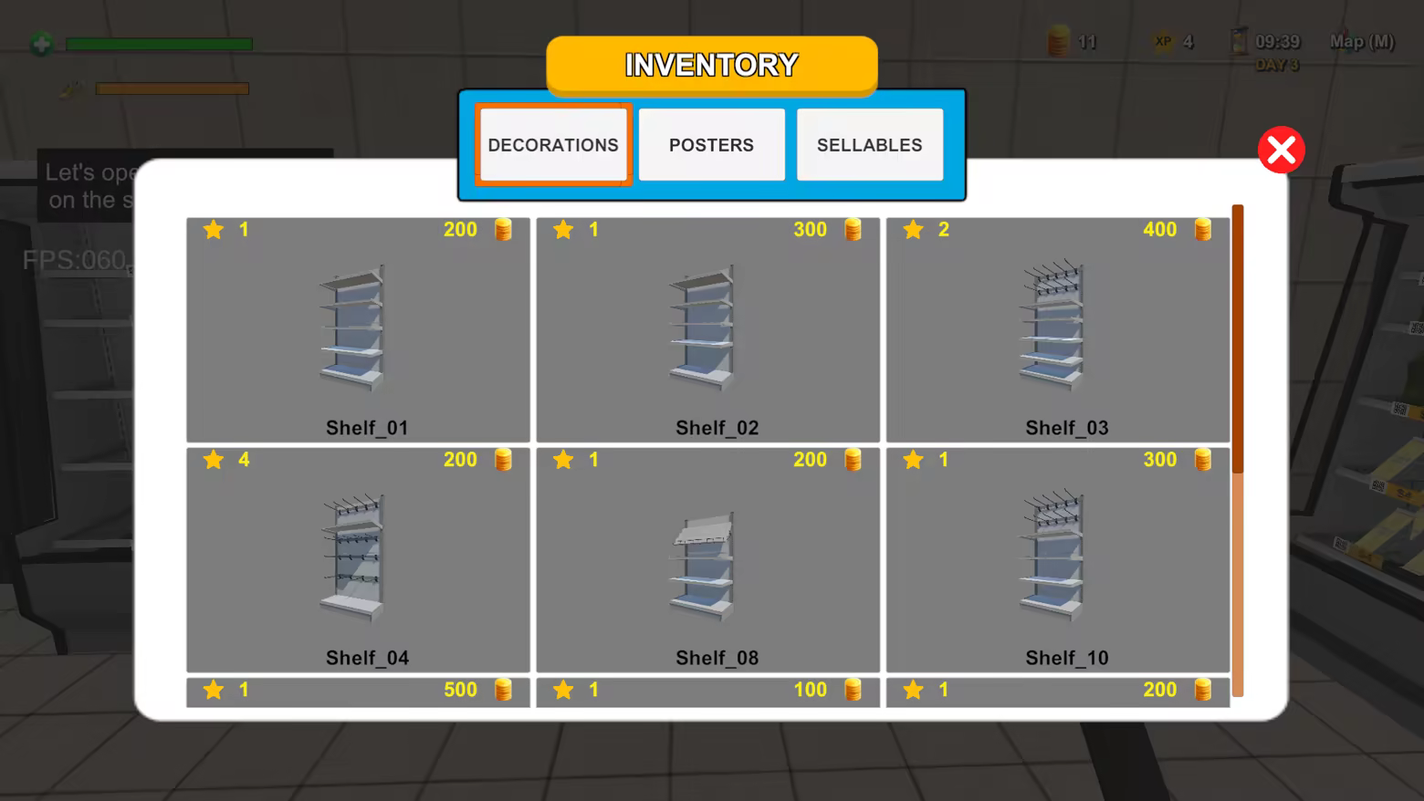 Purchase and install shelves from the inventory screen.