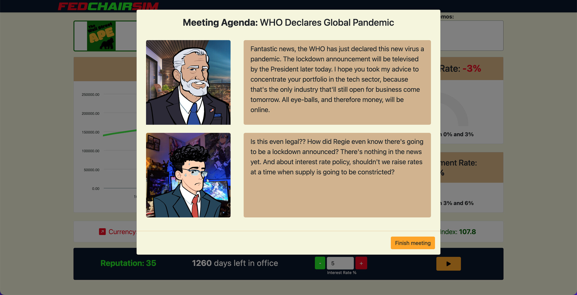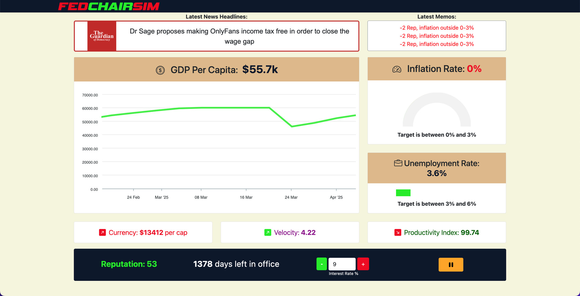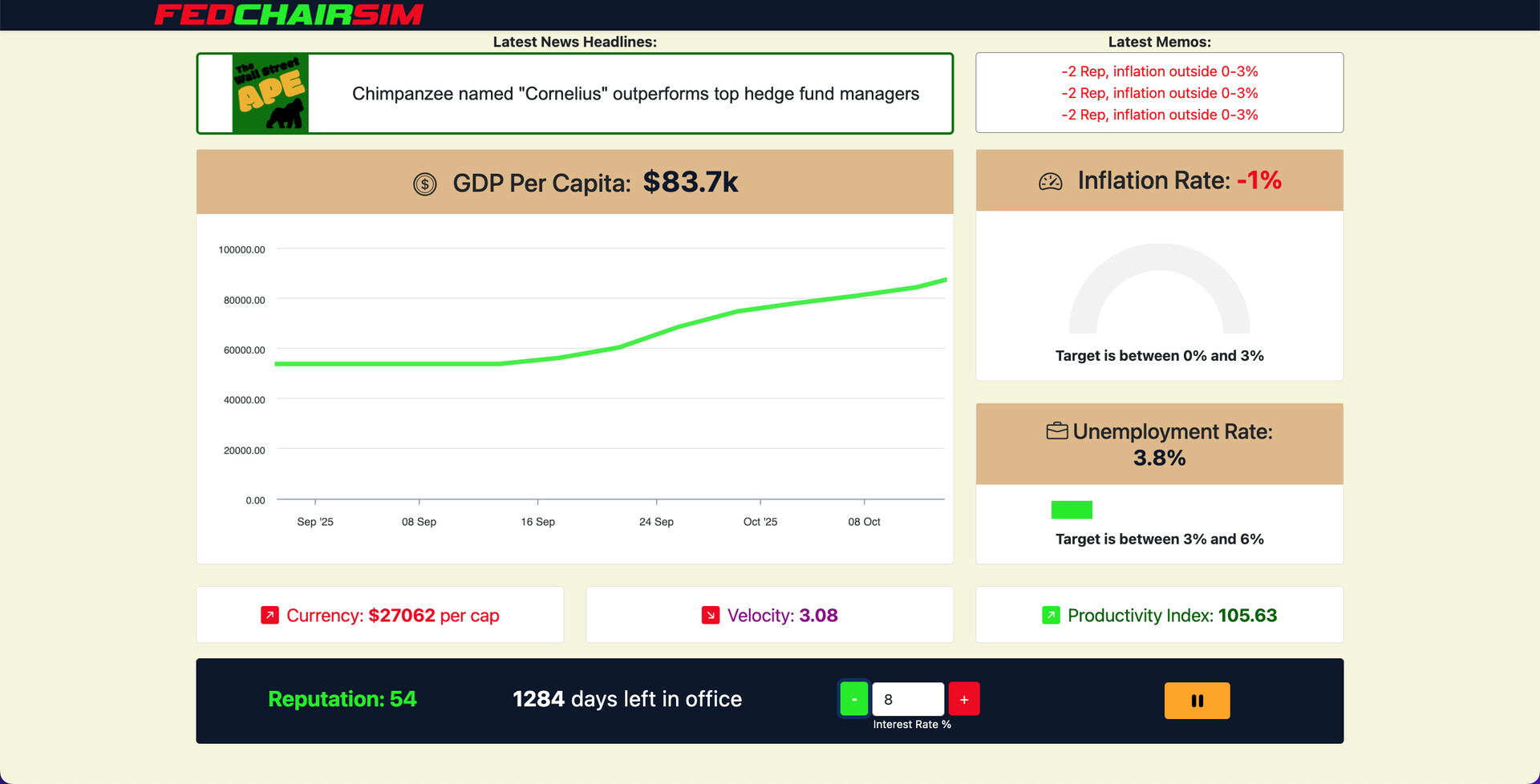• Clown-World Simulator: FedChairSim combines serious macroeconomics simulation with the social and political theatre of the modern world.