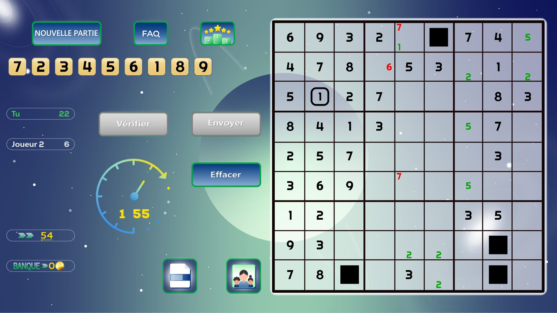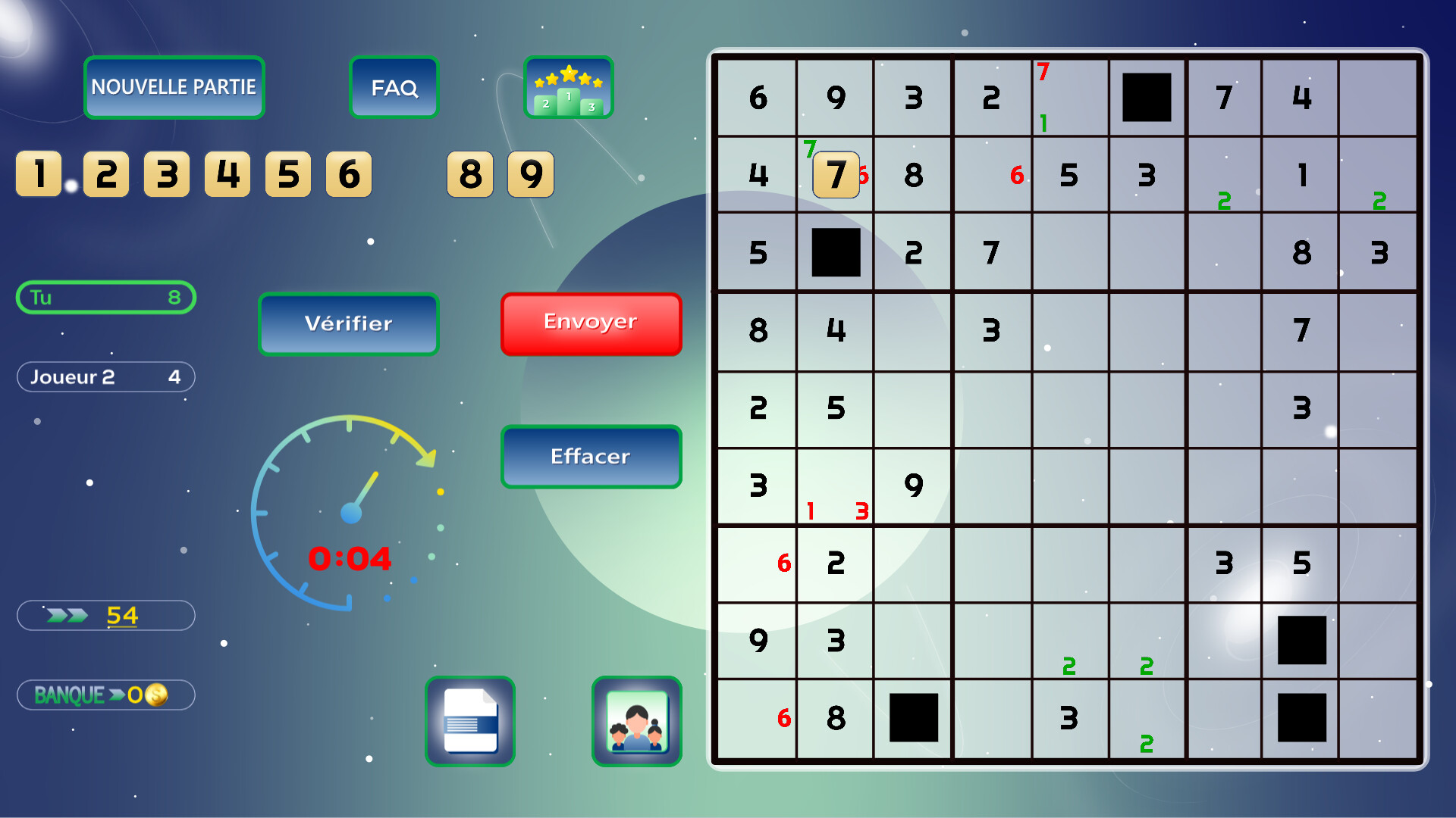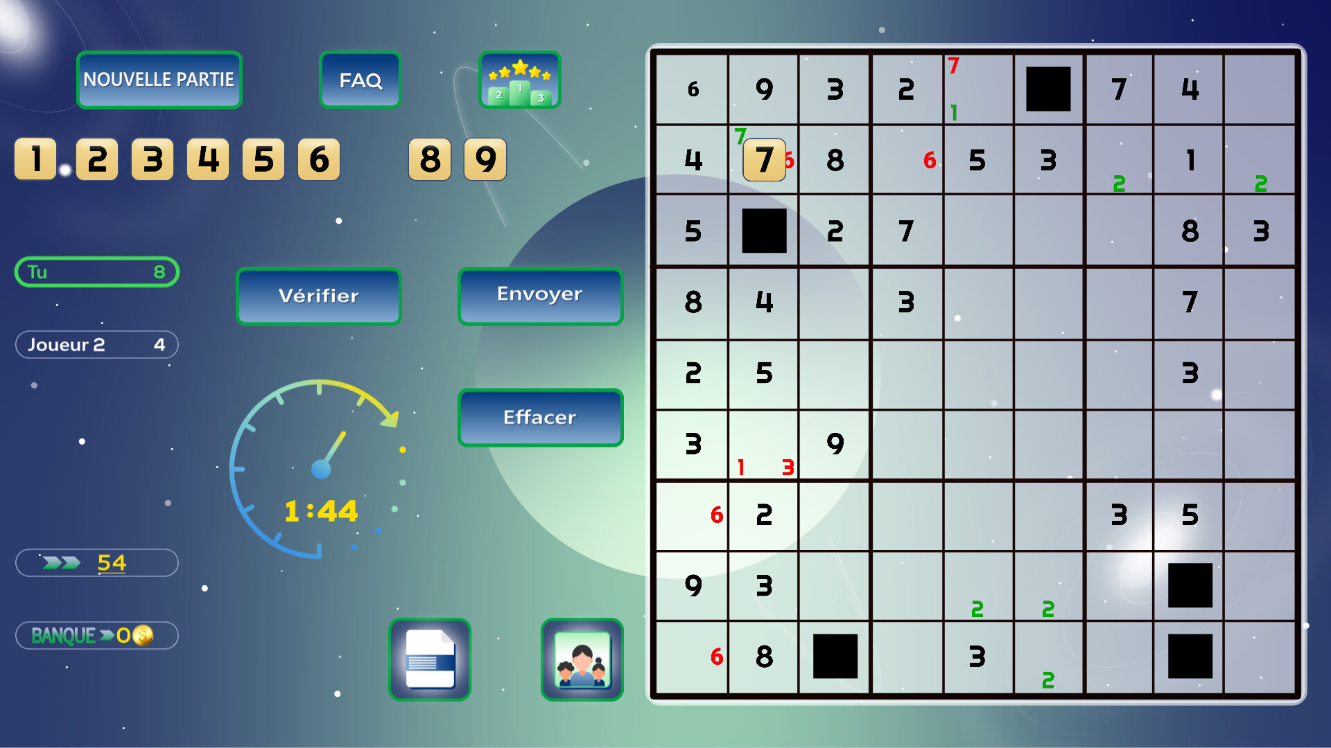 • La loi de l'harmonie : chaque ligne, colonne et carré 3x3 est un espace sacré où tous les chiffres doivent être uniques. Si votre coup est incorrect, un petit chiffre rouge apparaîtra dans la case — une marque d'erreur que les deux joueurs verront. Vous ne recevrez aucun point pour un tel coup.