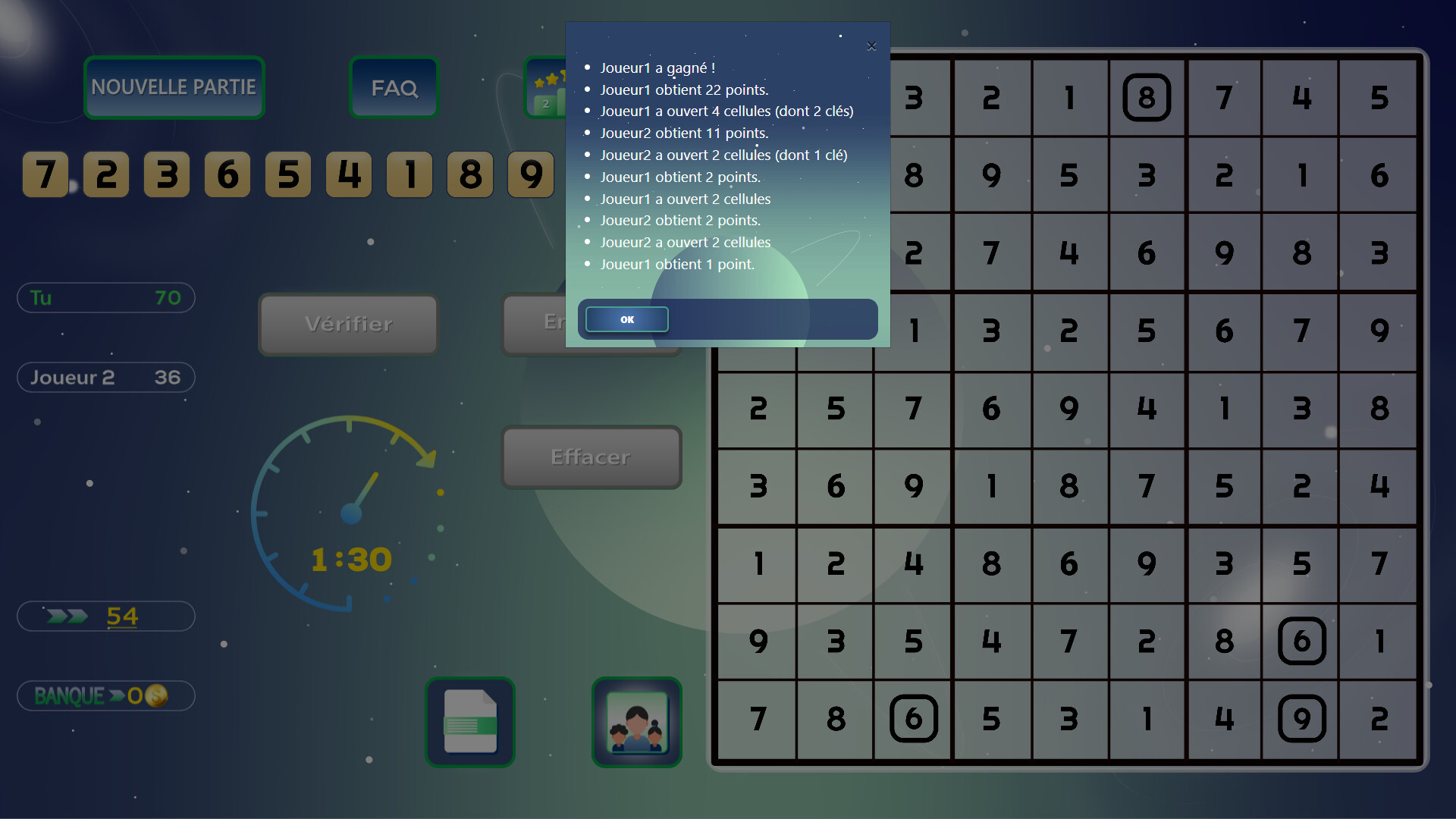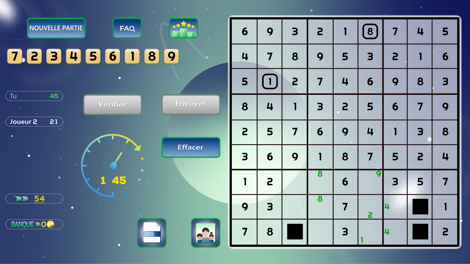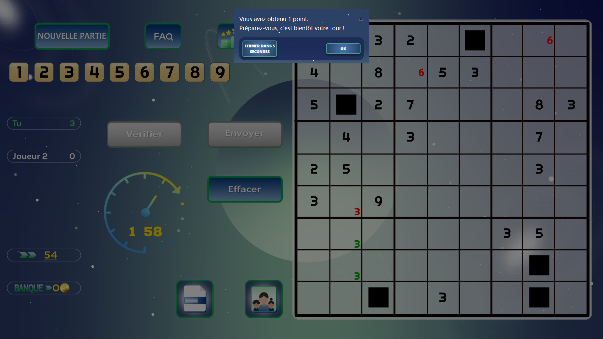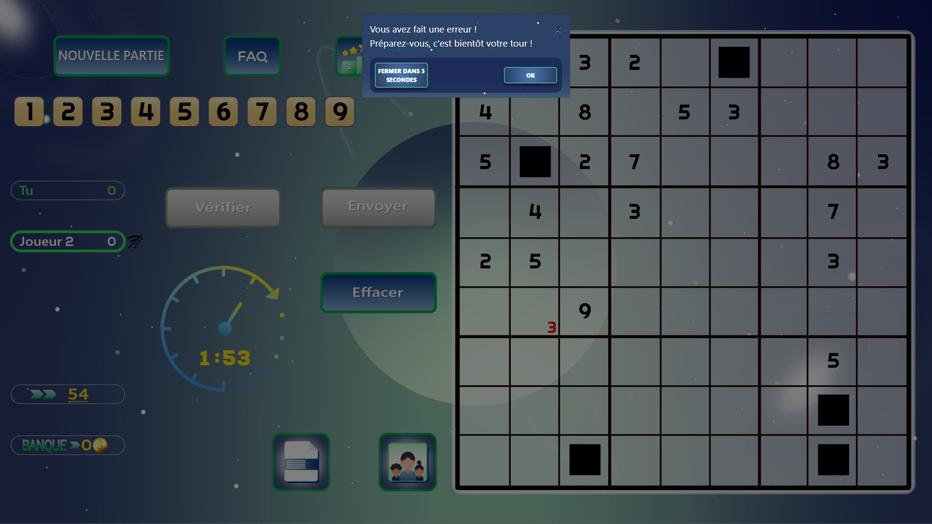 • La loi de l'harmonie : chaque ligne, colonne et carré 3x3 est un espace sacré où tous les chiffres doivent être uniques. Si votre coup est incorrect, un petit chiffre rouge apparaîtra dans la case — une marque d'erreur que les deux joueurs verront. Vous ne recevrez aucun point pour un tel coup.